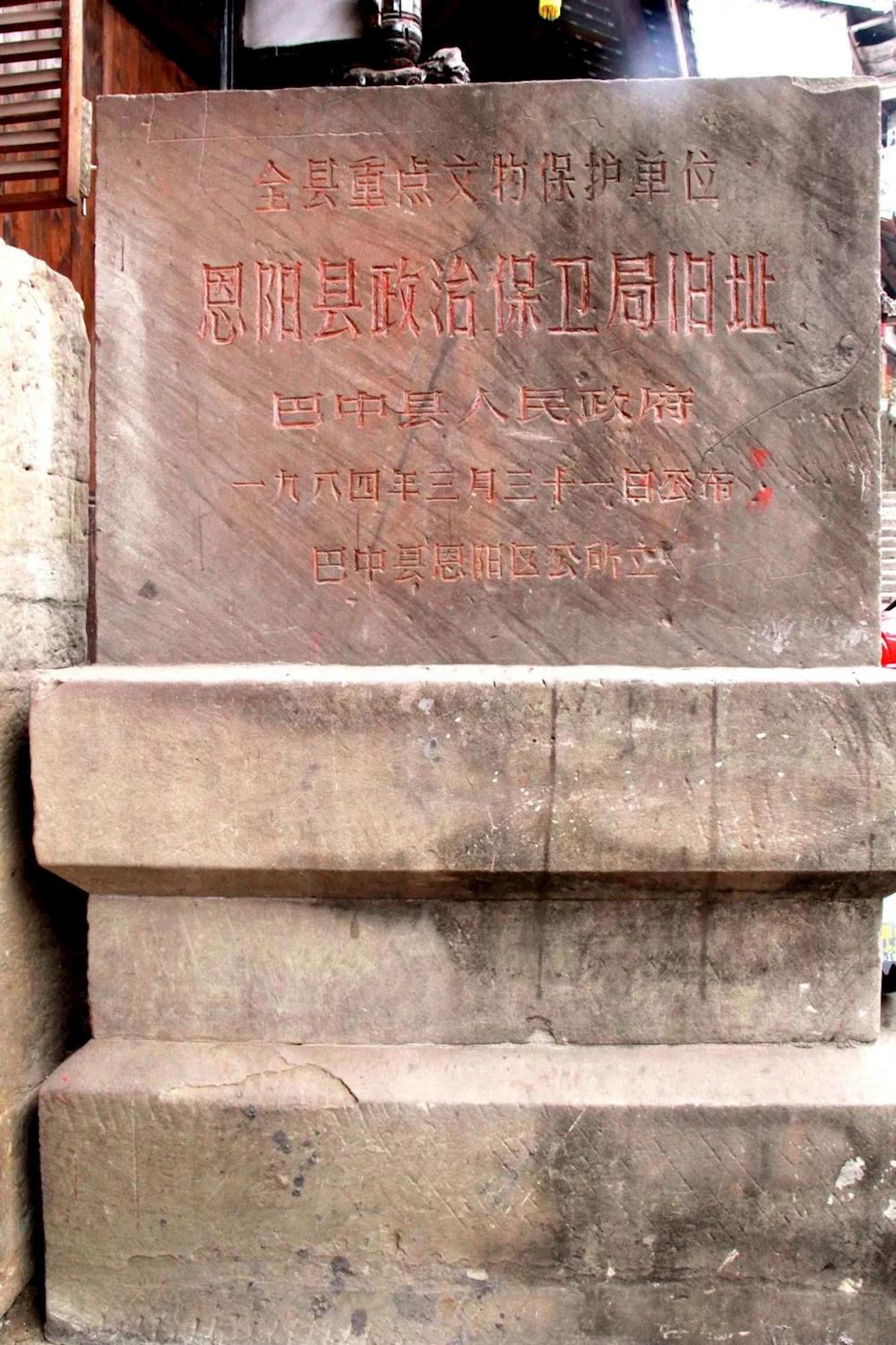 1933年至1935年,红四方面军在恩阳上正街、下正街长约400米的街道上,设有中国共产党川陕省仪阆县委、恩阳县委、恩阳财政委员会、法庭、红军经理处等各类行政机关13处,现保存较为完好的有8处,“红军胜利万岁”“粉碎川陕会剿”“为土地归农民而战争”等红军石刻标语随处可见。红军在此战斗、生活近两年时间,留下了许多珍贵的史料,大量的红军石刻石碑、红军革命遗址遍布与古镇之中。恩阳,不愧为一座露天的革命博物馆。