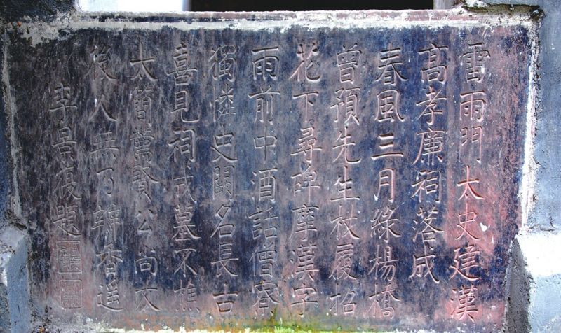 与石兽保存完好同样难得的是,在距高颐阙以北约两百处,高颐墓碑仍存。拨开齐腰深的蒿草,透过茂密的树丛,我又看见了仍然矗立的墓碑。它高近两米,宽约一米,可惜碑面字迹漫漶得已无法辨认。一般来讲,墓碑和陵寝在阙后面的中轴延长线上,至于延长多少,要看尊卑贵贱,如距此不远的芦山县樊敏阙。身为芦山县人的樊敏,历任青衣羌国(辖今雅安芦山一带)国丞、东汉巴郡太守,最后晋升为属国家级领导人的司徒,位列三公。像樊敏这般的显赫人物,级别比高颐高,因此据当地文物考古工作者推测,从樊敏阙向后可能延长几里路才是陵寝。