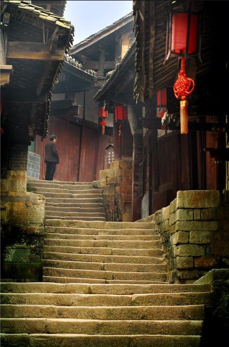 跨过起凤桥,拾级而上,眼前的景象让人有种穿越的错觉:高高低低的石阶,整齐划一的青石板路面,延伸出墙面的骑门柜台,低矮的房檐和长长的绣楼……仿佛时间不曾在这里留下痕迹。河边的茶馆,是古镇居民聚集地之一,从谈天说地中,方能感受古镇如今的烟火气。
