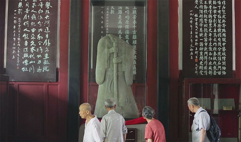 在李冰像旁边,还矗立着一个手中执锸的无头石像,被称为“无头堰工”像。