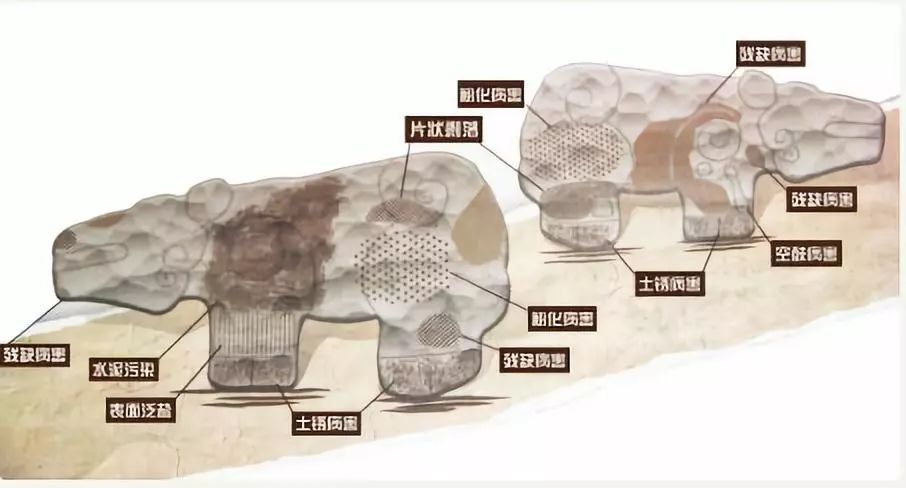 石犀的面上,被现代建筑物破坏和覆盖,所以当场做了一些简单清理,然后就把它运往金沙遗址博物馆的文物保护中心,做进一步修护。
