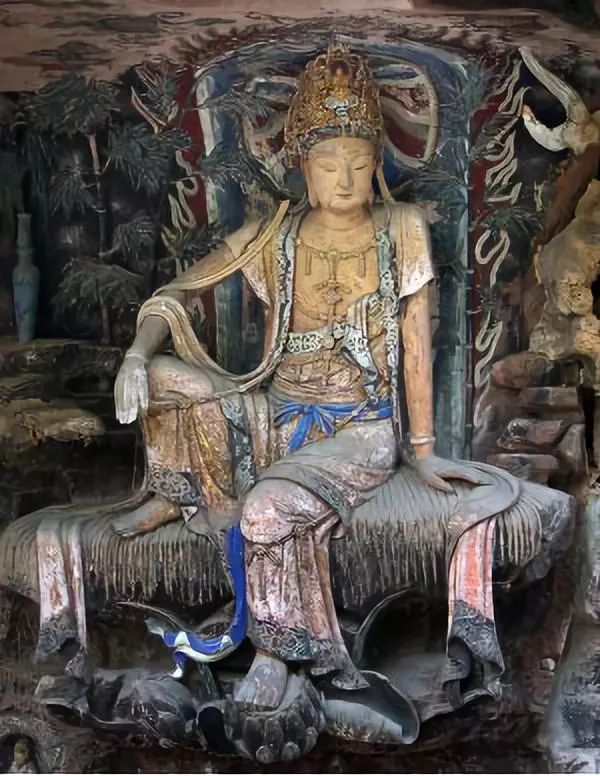 “紫竹观音”,是全国罕见的北宋石刻艺术珍品。像高3米,半镂雕悬坐在一突出岩石峭壁上,背倚浮雕紫竹和柳枝净瓶,头戴装饰华丽的宝冠,上身着披肩短袖薄裟,袒胸露臂,璎珞像虬曲而下的金色飘带,翠环网坠于胸腹,下身彩带结一绣花轻薄如蝉翼的长裙,裙角皱纹飘逸自然。其容貌风姿恰似出水芙蓉侧身跷足坐于蒲叶座上,左手下撑,右足上跷,赤足分别踏在蒲叶座和莲花蕊上,凤眼下视,巍峨庄重,柔和亲昵,如韶华绝伦的妙龄女郎。其世俗化风味很浓,具有人的美,神的仪,被称为美神,造像的设计和雕技达到了令人倾倒的程度,观赏后的专家、学者誉之为“东方维纳斯”。