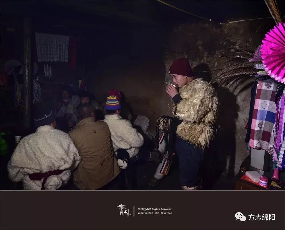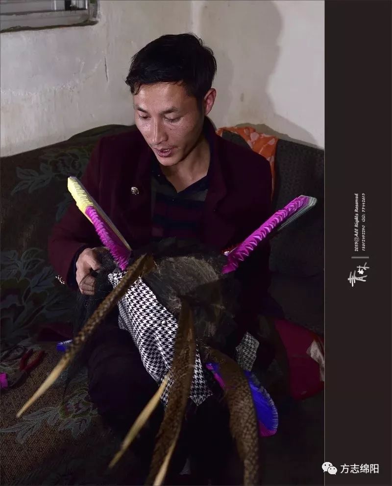 与此同时,在屋内等待上场的“曹盖”师们也没有闲着,他们在忙着给“曹盖”装上彩纸花冠和野鸡尾羽。一旦“白莫”的号令来到,七位“曹盖”师便反穿羊皮袄,脚扎白色羊毡绑腿,随时出征。戴上“曹盖”后,“曹盖”师们便完全隐去了原来的面目,成为了神的代言。