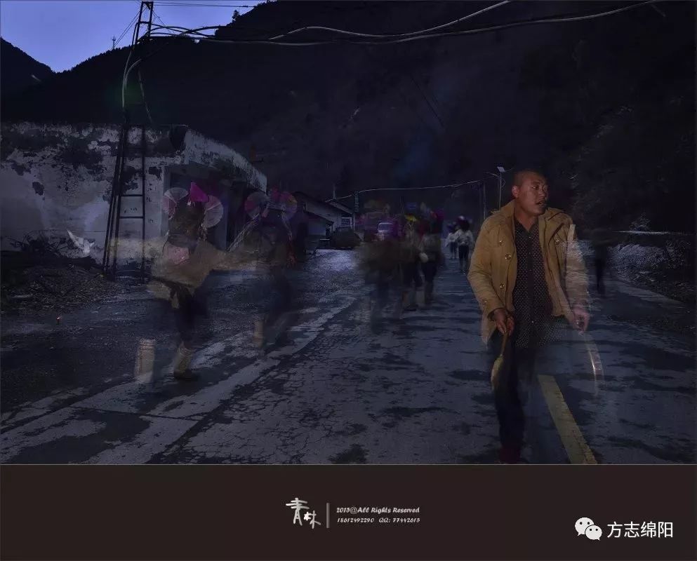 广场上的“曹盖”舞结束后,“白莫”助理王贵高举“翔祷”,沿省道205向“白马老爷”山方向飞奔,身后是七位“曹盖”师和身穿节日盛装的男女老少,大家载歌载舞,不时变换着队形和舞蹈形式。省道205是通向九寨沟的交通要道,平武县交警大队火溪河中队还安排了几位交警执勤,沿途的车辆行人都纷纷驻足观看拍照,大家都喜气洋洋,丝毫没有堵车的不悦。