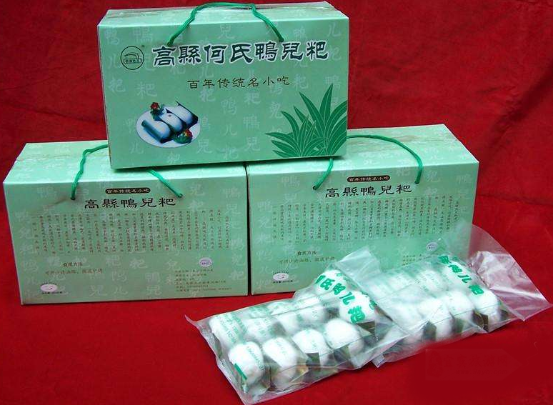 四川高县何氏鸭儿粑,距今已有百余年历史,以其鲜嫩如雏鸭“三不粘”(即不粘口、不粘筷、不粘叶)受到社会各界广泛赞誉。2001年,何氏鸭儿粑获得宜宾授予“川菜名点”荣誉证书,2003 年,注册商标即“玉石清香”是宜宾知名商标。2008 年,何氏鸭儿粑被宜宾市人民政府公布为“第二批市级非物质文化遗产”。