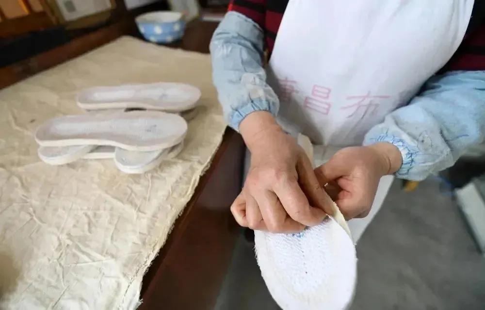 2018年2月12日,习近平总书记调研战旗村时也购买一双唐昌布鞋,新闻媒体的宣传使川西手工布鞋淡去的文化,再度浮于社会大众跟前。老歌《中国娃》(1997年春晚曲目)唱:“最爱穿的鞋是妈妈纳的千层底,站得稳走得正踏踏实实闯天下……”到20世纪六七十年代,很多大人、孩子脚上穿着的仍是母亲一针一线纳成的布鞋。如今,昔年川西最富裕的上五县“温、郫、崇、新、灌”之“崇”虽已并入历史的尘轨,这种寻常但传承了几千年的千层底、棉布面手工布鞋制作技艺,却得以保留发展,成为非物质文化遗产的一大特色。