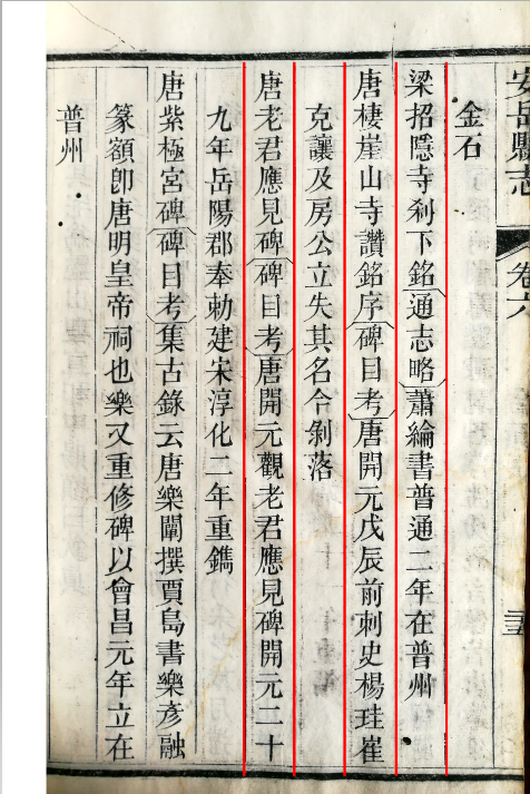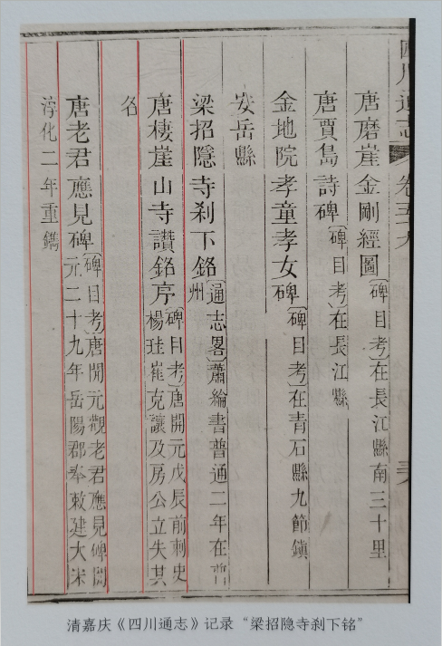 一是清嘉庆本《四川通志》之《金石》记载,可追溯到南朝梁武帝普通二年(521),即“梁《招隐寺刹下铭》(通志略)萧纶书,普通二年,在普州(今安岳)”。这里说的“通志”应是比《四川通志》(清嘉庆本)更早的《四川通志》。