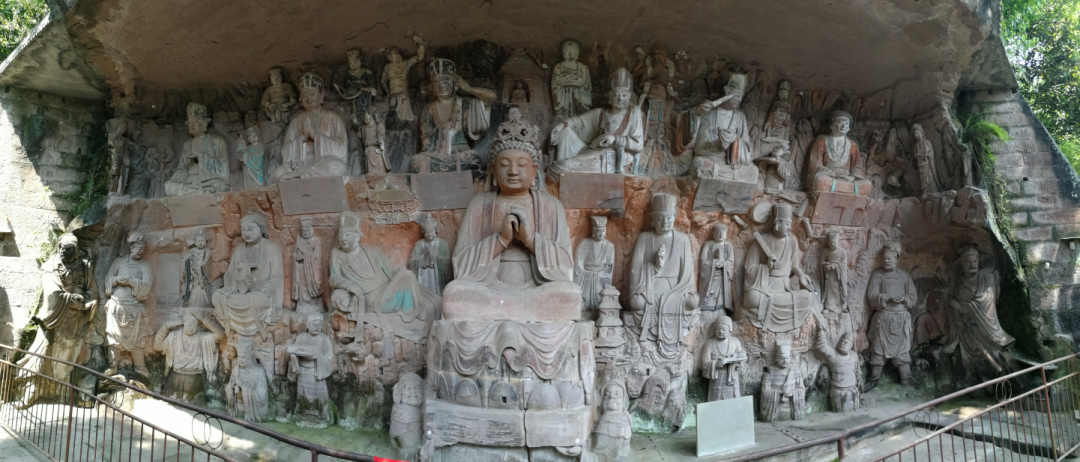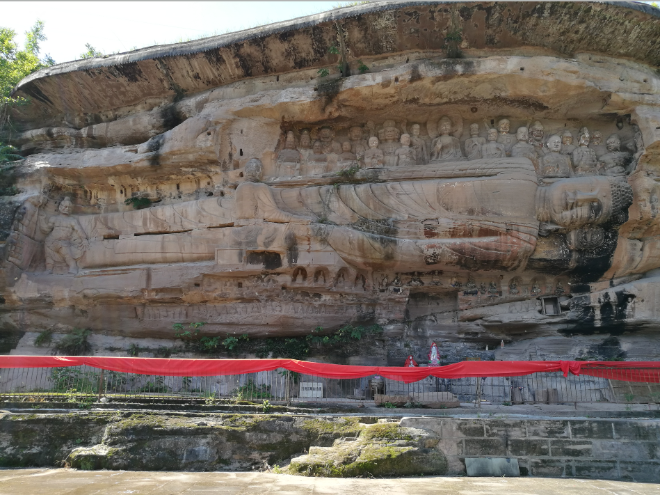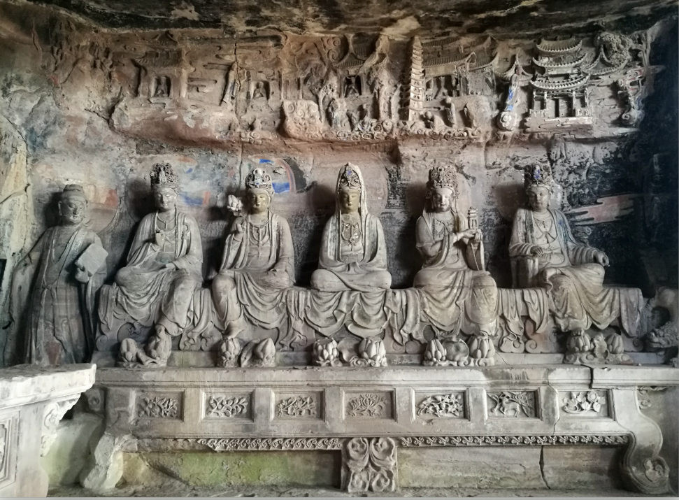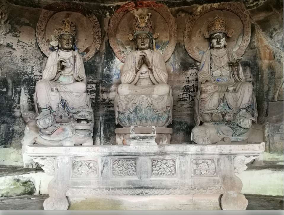二是在题材内容表现上,既有佛教中显教和密宗题材,又有道教题材(以玄妙观为代表)、儒释道“三教合一”题材(以大般若洞为代表);既有卧佛院的中原石刻表现的佛教题材及传递的皇家背景和意志诸信息(特别是卧佛卧姿突破佛教造像仪轨的唯一性,堪称智慧、创新的代表),又有毗卢洞以柳本尊为首的四川密宗及相关的地方性题材(特别是以柳本尊为首倡导的“残肢体,颂密咒,设道场”的四川密宗造像,颇具规模,风靡川中一带,深植侍佛信善者心田,有的甚至为中国北方石窟闻所未闻,具有佛教题材地方化、世俗化的相对唯一性)等。