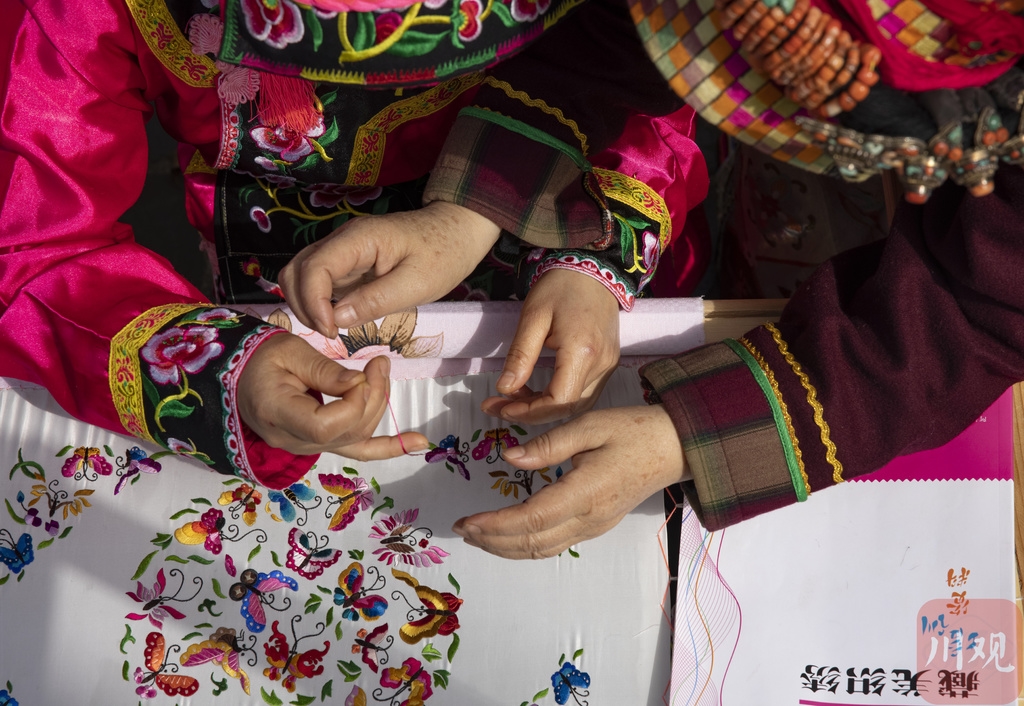 在杨华珍指导下,女学员们用灵巧双手飞针走线,白布上渐渐呈现出“蝶舞花间”图案雏形。