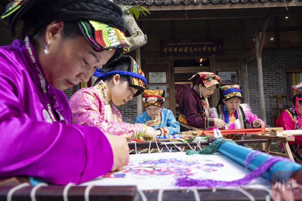 在成都市邛崃市藏羌织绣传习所,来自阿坝州和邛崃市南宝山藏族羌族女学员学习藏羌织绣。