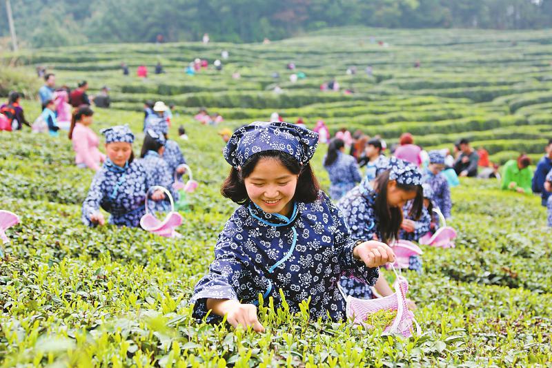 皇家山采茶节上,村民和游客采茶忙。
