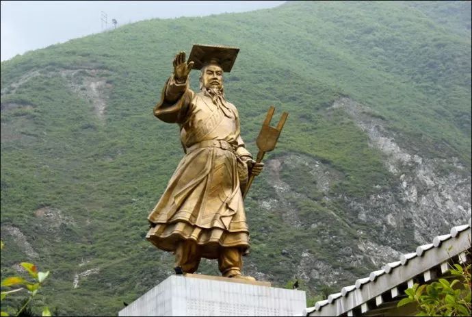 矗立于岷山之畔,石纽山腰大禹祭坛上的大禹铜像。铜像悬胆方口,头戴四面斜坡平天冠,束髪带依稀可见。双耳垂轮,双眉入鬓,左肩挎网罟,右手执耒锸,足登笮编芒鞋。一尊云水襟怀,仰望星空(图片来自网络)