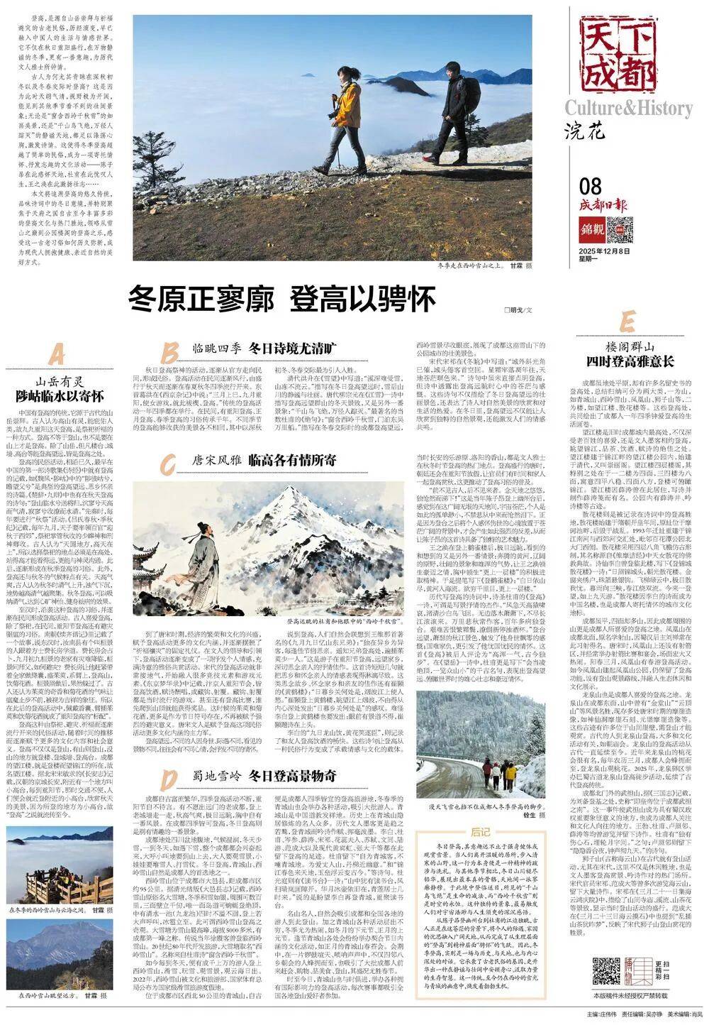 从陈子昂登幽州台到杜甫的江边独眺,古人正是在这苍茫的背景下,将个人的际遇、家国的忧思融入广阔天地,从而完成了从生理层面的“登高”到精神层面“骋怀”的飞跃。因此,冬季登高,实则是一场与历史、与天地,也与内心深处的对话。它承袭了古老民俗的基因,更升华出一种在静谧与壮阔中安顿身心、汲取力量的生存智慧。这一传统,至今仍在西岭的雪光与青城的幽意中,焕发着勃勃生机。