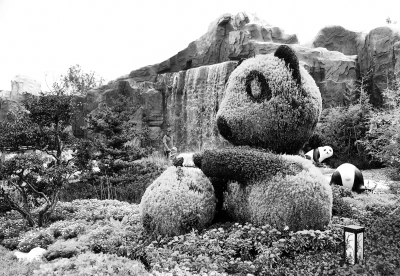 “爸爸妈妈!这里有大熊猫!”“我也要拍,我要和它们照照片!”天真童声的来源处,创意熊猫雕塑映入眼帘。都江堰江滩鱼嘴和安澜索桥的符号、辣椒、川西的特色建筑,一切的信息都在告诉游客——您到四川园了!