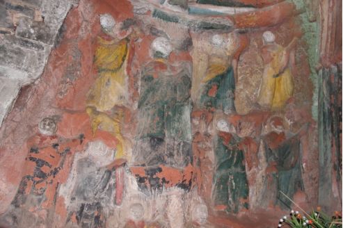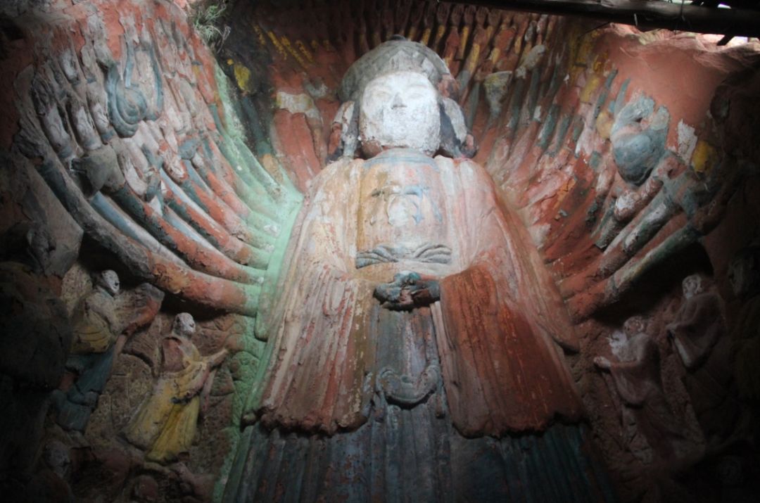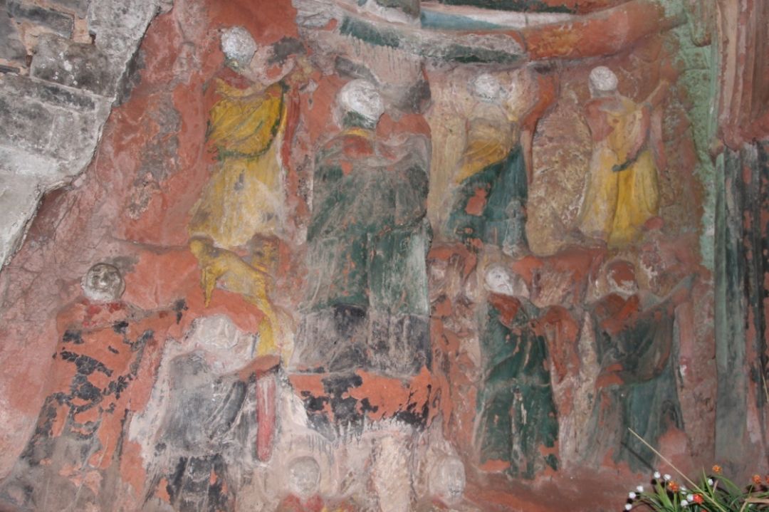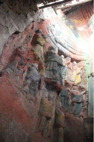 大蓬硐龛窟为平顶方形龛,高2.8米,宽2.8米,深0.7米,坐像,头戴皇冠,身着朝服,妙相庄严。建造时左边有王母横排并坐,建国初已毁。龛外有题记,因风化严重,大部字迹已不清。