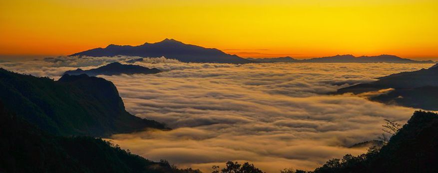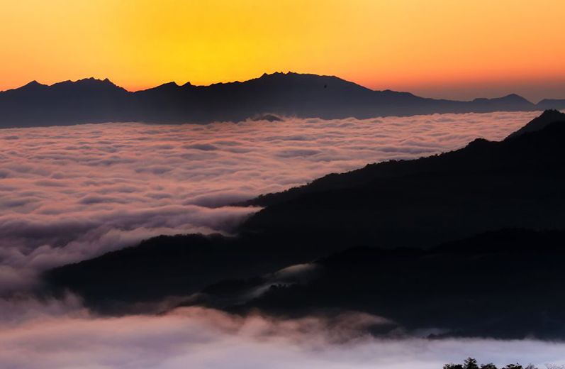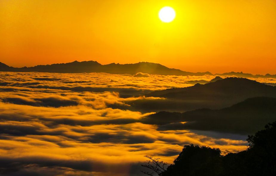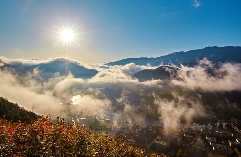 当日出从群山之间升起,清晨第一缕阳光映照着漫山红叶;当云海升腾在山谷之间,犹如波涛拍打两岸的丛林,日出、云海同时展现在眼前,就是这样一副景象!