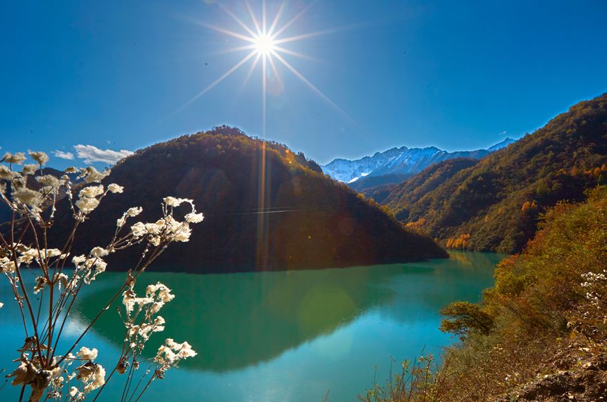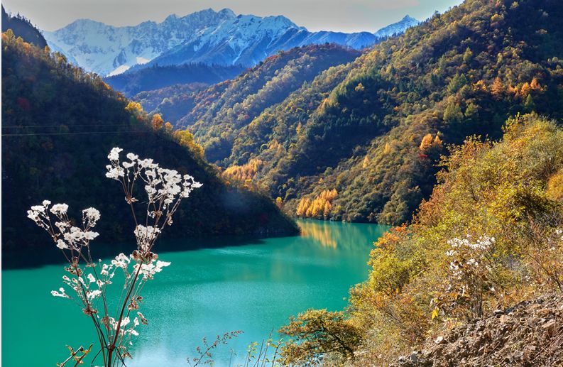 雪山彩林同框的白马湖