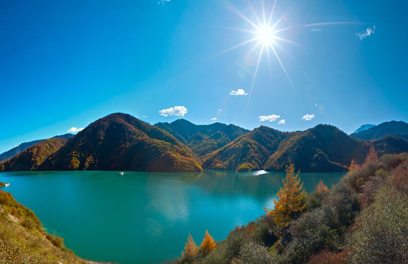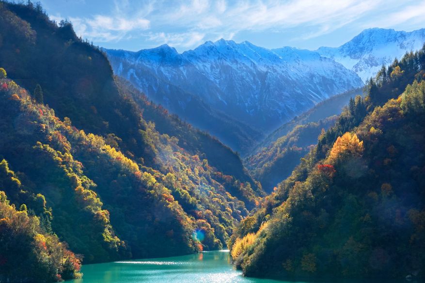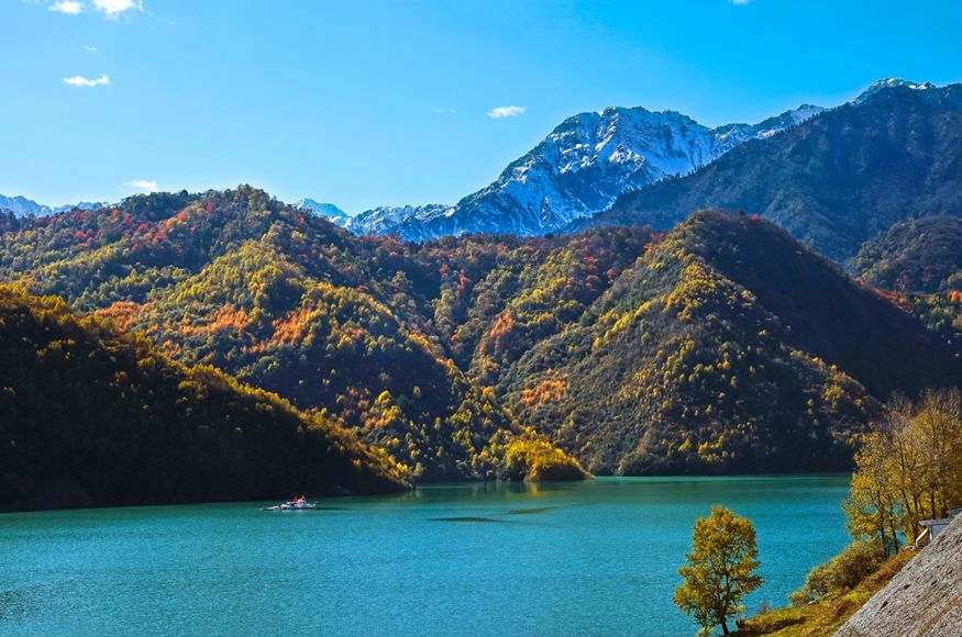 进入深秋,全长10余公里的白马湖是它一年中最为华丽的季节,彩林与雪山的交响已拉开序幕。