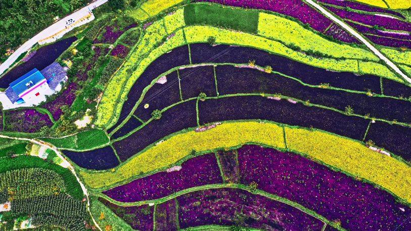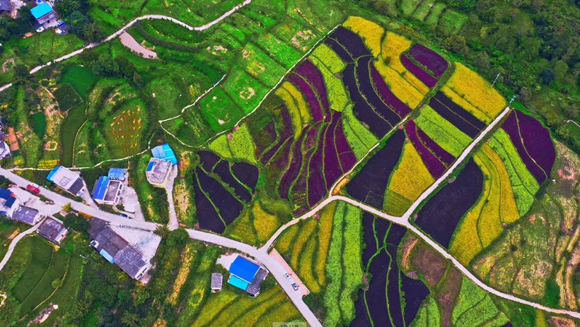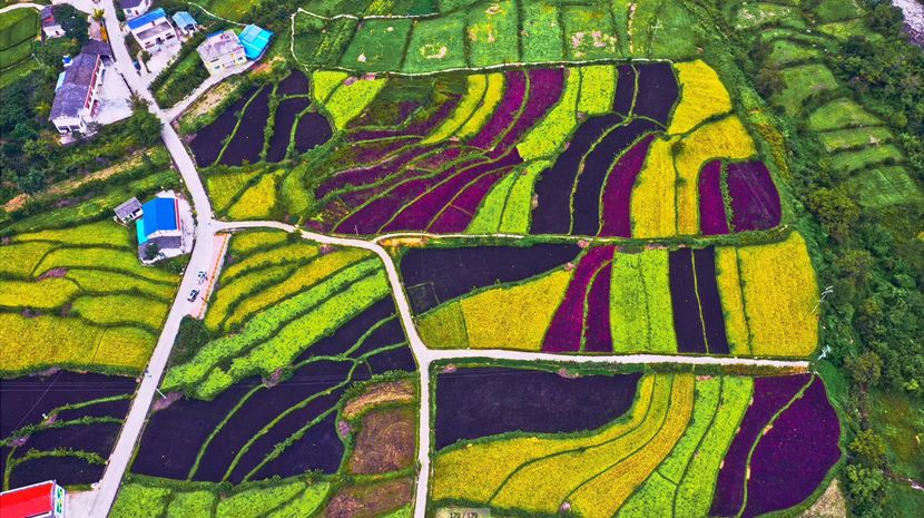 高村乡原种彩色水稻田,绿、白、黄、红、紫五种颜色同时上线,整片稻田宛若彩虹,让人眼前一亮!