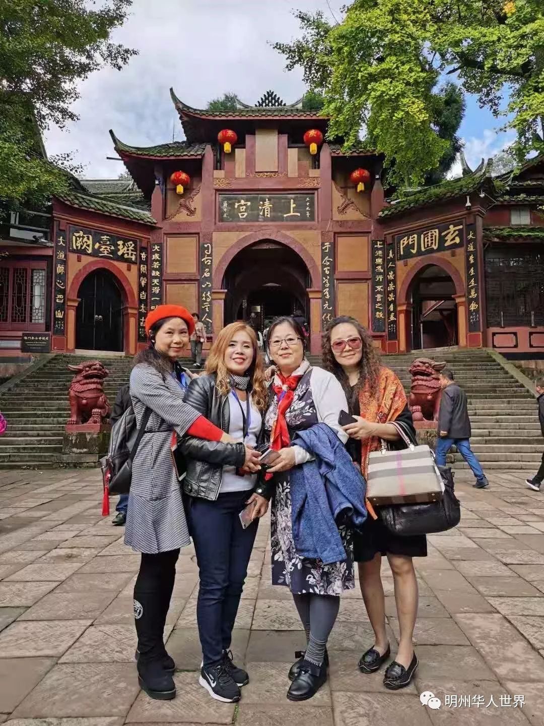 我们媒体团四位女士在青城山上清宫前合影 (左一为埃及《中国周报》副总编朱新娥、右二为德国《德华世界报》主编倪娜、右一为美国《华盛顿中文邮报》社社长金浩静)
