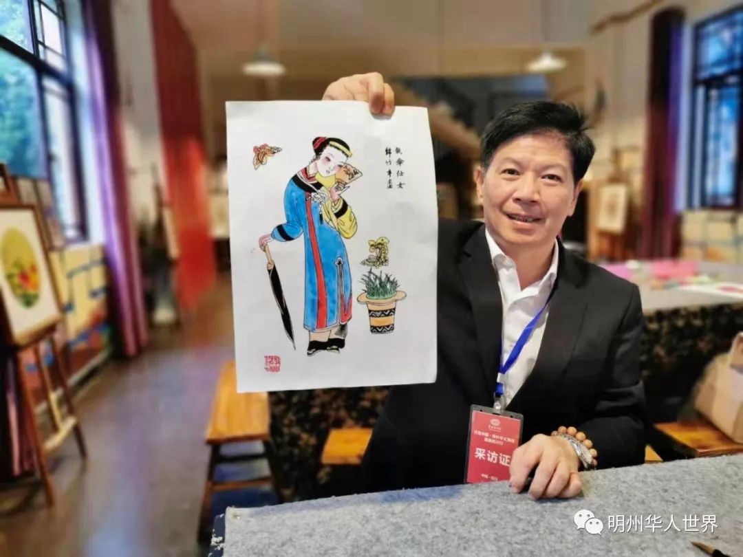 台湾《南华报》董事长兼社长赖连金先生展示他绘制的年画作品“执伞仕女”