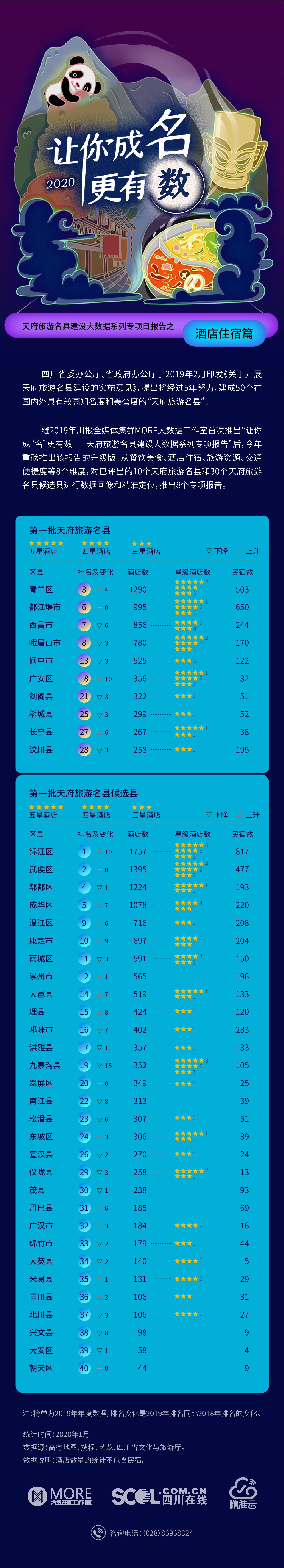 为助力天府旅游名县建设,2020年4月15日,川报全媒体集群MORE大数据工作室重磅推出“2020·让你成‘名’更有数——天府旅游名县建设大数据系列专项报告”。该报告参照天府旅游名县评选标准,以数为据,继续从吃、住、行、游、娱、口碑等方面为参选区县进行数据画像,为相关区县的旅游名县建设提供参考。