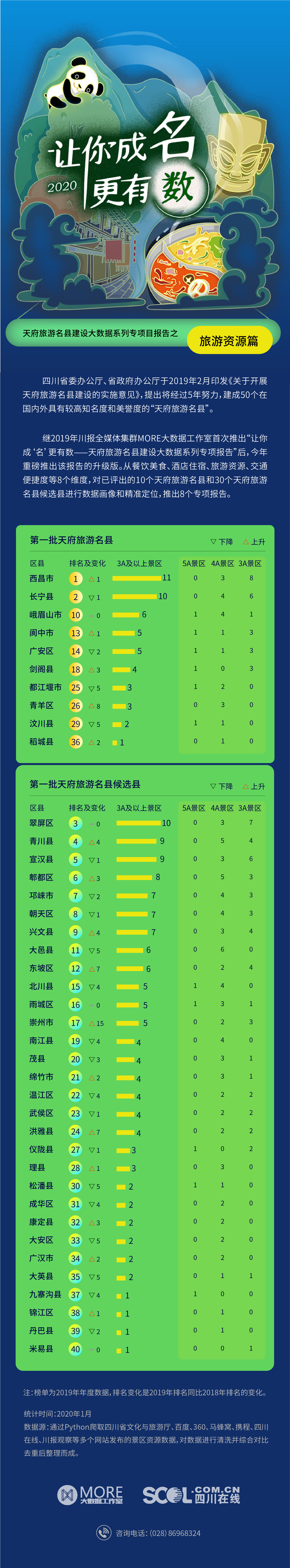 为助力天府旅游名县建设,川报全媒体集群MORE大数据工作室重磅推出“2020·让你成‘名’更有数——天府旅游名县建设大数据系列专项报告”。该报告参照天府旅游名县评选标准,以数为据,继续从吃、住、行、游、娱、口碑等方面为参选区县进行数据画像,为相关区县的旅游名县建设提供参考。