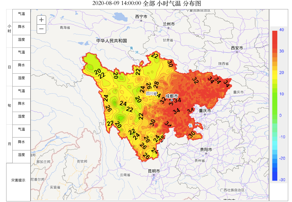 2020年8月9日,成都、德阳、绵阳、广元、乐山、宜宾、雅安、眉山等多地发布超30条高温预警。从四川新闻网发布的当日14:00四川气温分布图看,四川境内有一半都是红的,炎值爆表。