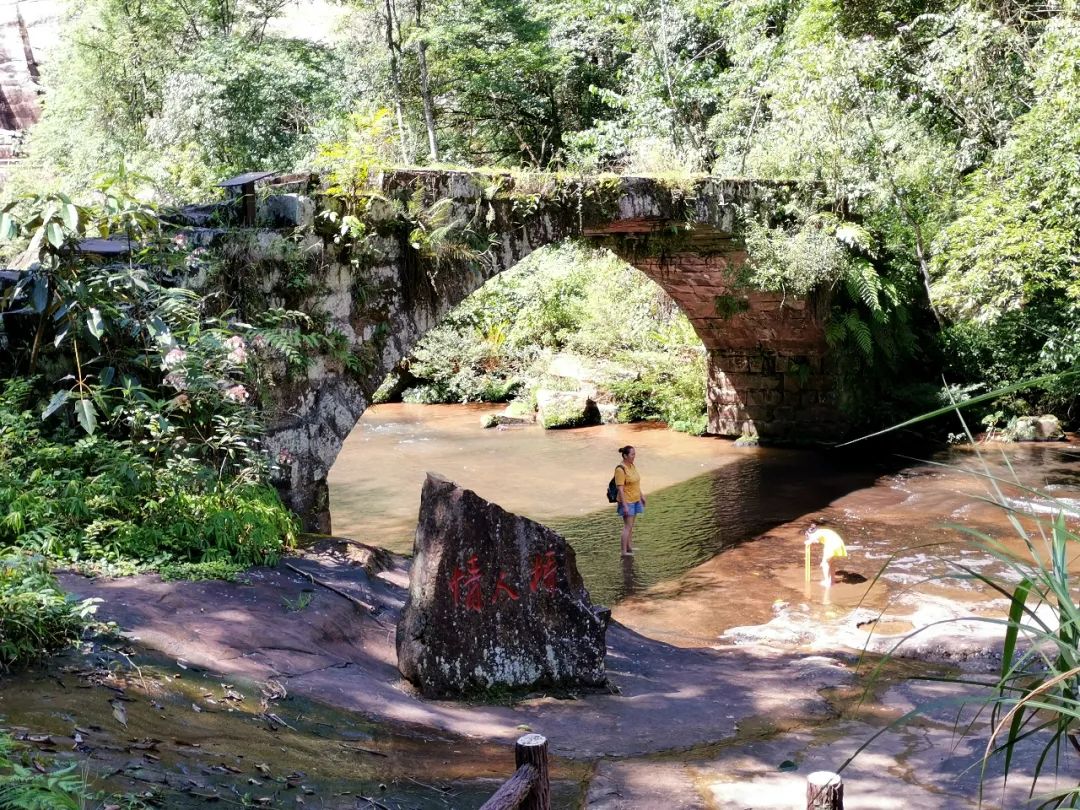 情人桥原名白云桥,始建于南宋年间,后于1980年局部维修,桥体全为当地丹霞石材,横跨于地质奇观北纬28°线和八节洞瀑布群河谷。该桥本为方便川黔两省人民通商交往的“茶马古道”而建,见证了川黔两地人民交往的友谊之桥,后因当地少数民族散居较多,少数民族同胞在情人佳节时,隔河对唱情歌,有缘人相会于桥上,演绎了一段段跨越北纬28°线的爱恋,故得名情人桥。