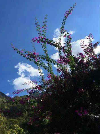 其实,到米易的第一天,走出机场,坐在去往县城的大巴上,就看到了马路两旁招摇的色彩,那是三角梅,一丛丛一簇簇地开放着,自在随意地抛头露面,就像是在城市的每个角落都能看到的讨生活的打工者,身上随意地穿着牛仔裤T恤衫,行色匆匆,没有半点儿娇贵的意思。在我的家乡青藏,三角梅也是有的,但它们都是种植在花盆里,养花人每天悉心伺候着,怕冻着,怕热着,怕干着,怕淋着。白天端到阳台上晒太阳,晚上降温了赶紧端进内屋里。如此,它们便像是养在深闺人不识的小家碧玉,足不出户,小姐脾气。
