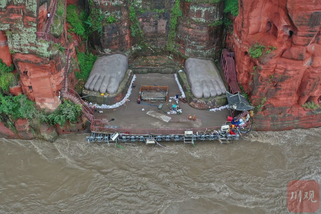为应对强降雨,乐山大佛景区管委会于8月17日凌晨提前关闭景区,对包括乐山大佛本体在内的各级文物保护单位、全山地质灾害、码头及游船、施工场地等开展安全隐患排查整治,及时消除强降雨可能引发的安全事故。同时根据防汛预警情况,立即于8月17日傍晚调集景区工作人员、公安民警及市中区民兵等力量,共计180余人,组织沙袋运往佛脚平台沿佛脚脚踏堆放,以避免洪水对大佛本体的直接冲撞。