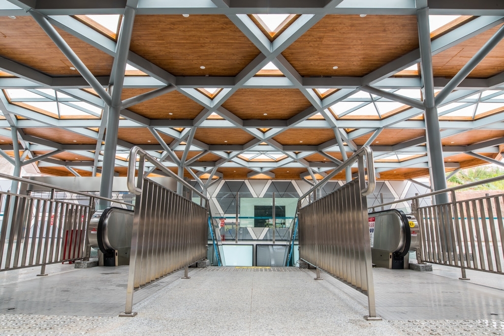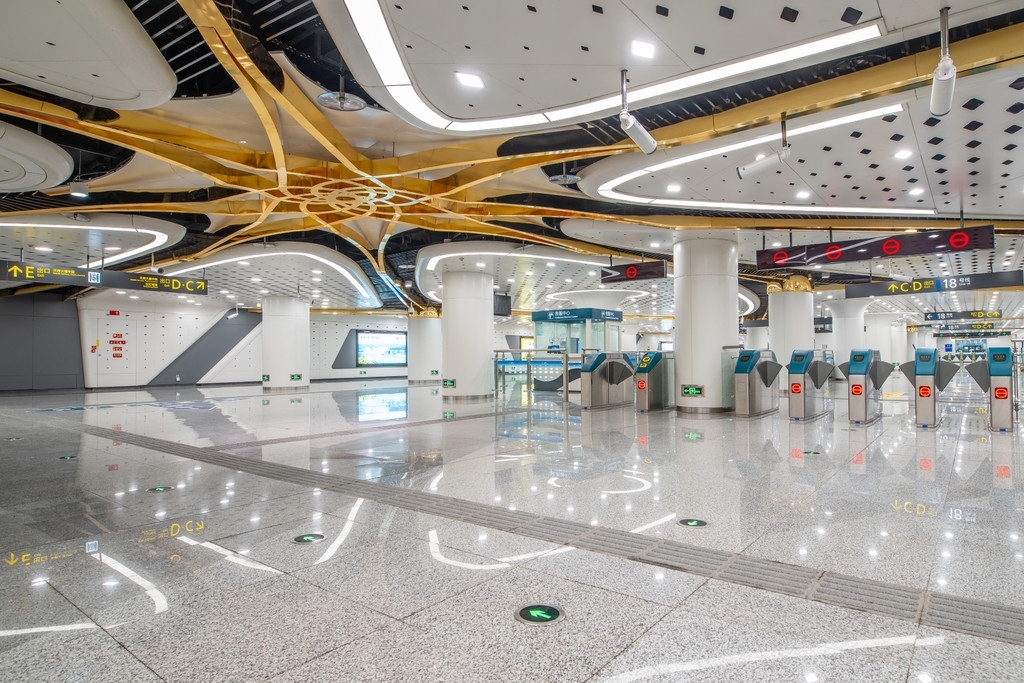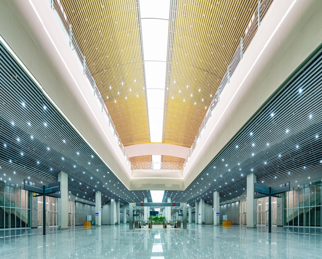 其中,三岔站地处成都东部新区远郊地带,周边为自然田园风貌,规划打造成为重点TOD项目。顶棚设计简洁大气,装修材质采用混泥土和金属管线配搭,将东郊山野的粗犷和装修工艺的细腻相融合,使空间效果精致而壮丽。