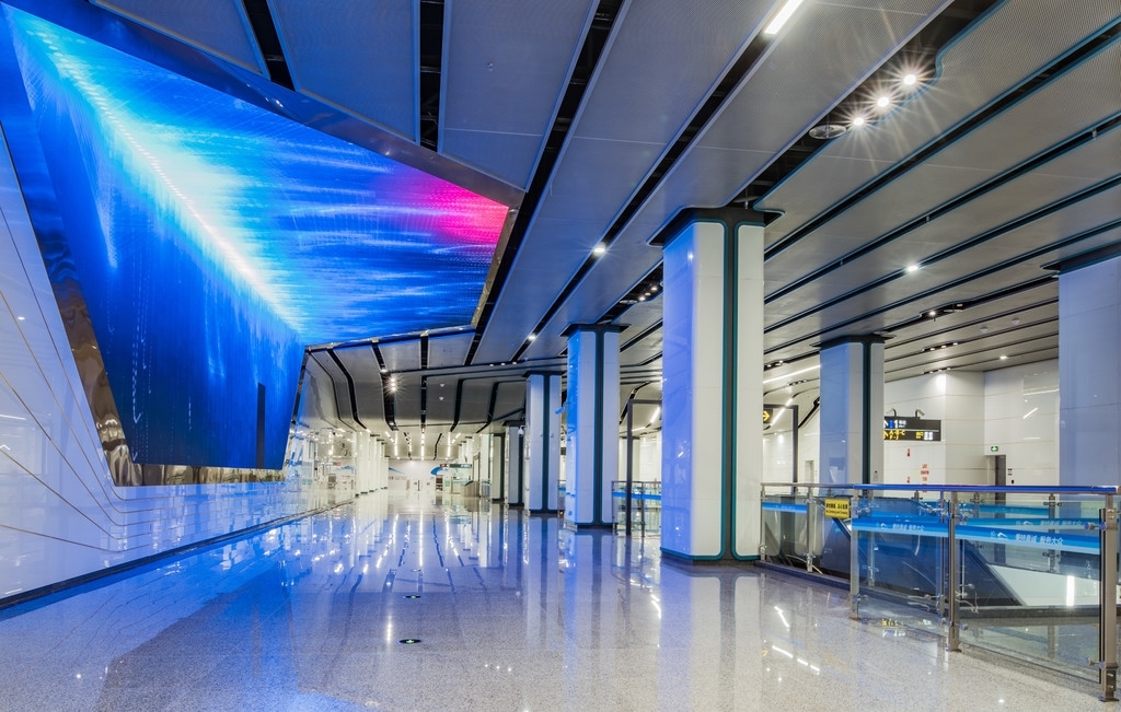 孵化园站以“科技创新”为设计主题,以“折线”三维元素将空间、灯具、综合末端一体化设计,整体空间简约大气,富有科技未来感,契合“创业天府”的文化定位。艺术品结合造型嵌入多媒体艺术装置,增加趣味性和互动性,展现科技无限的遐想,实现艺术空间一体化。