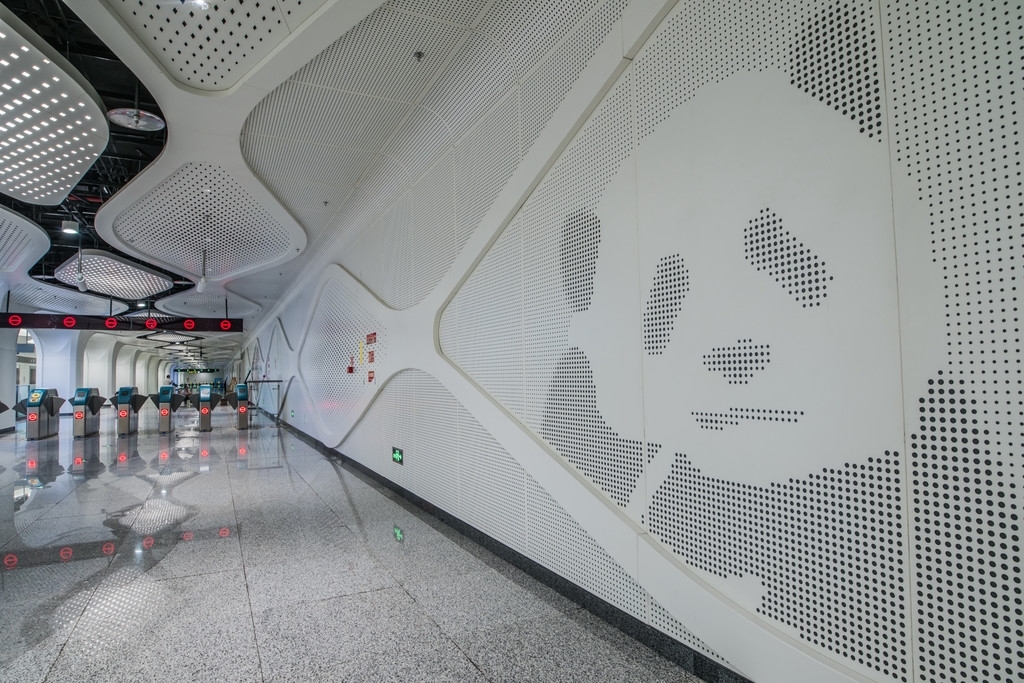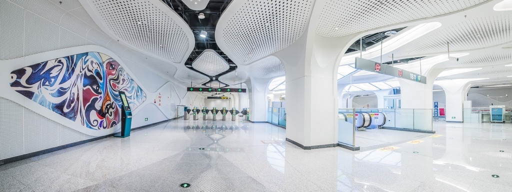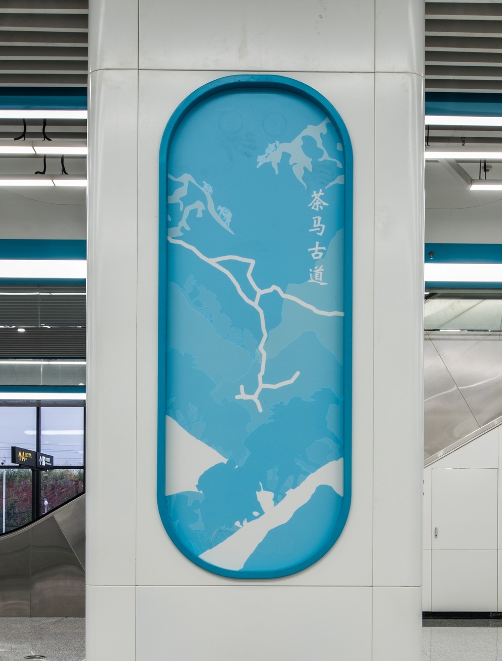 此外,18号线还有火车南站、海昌路站、西博城、兴隆站、三岔站等5座一般艺术车站,以蓝绿色椭圆+条带状背景撑起巴蜀文明的青山绿水之貌,立柱覆盖糖画、川剧变脸、巴山蜀水、茶马古道、云竹等蓉城标志性图案,地面铺装则采用常规的白麻花岗岩,注重美观和实用。
