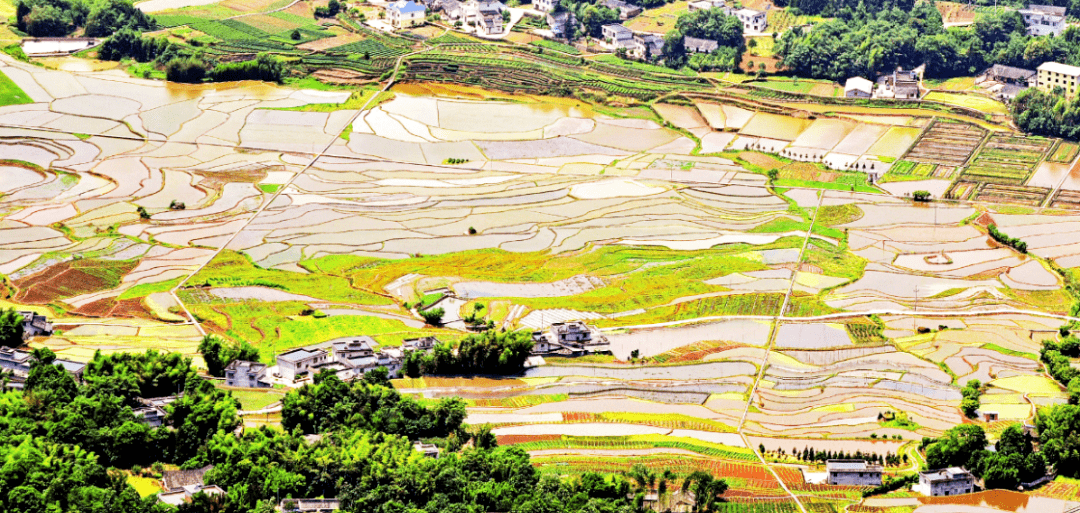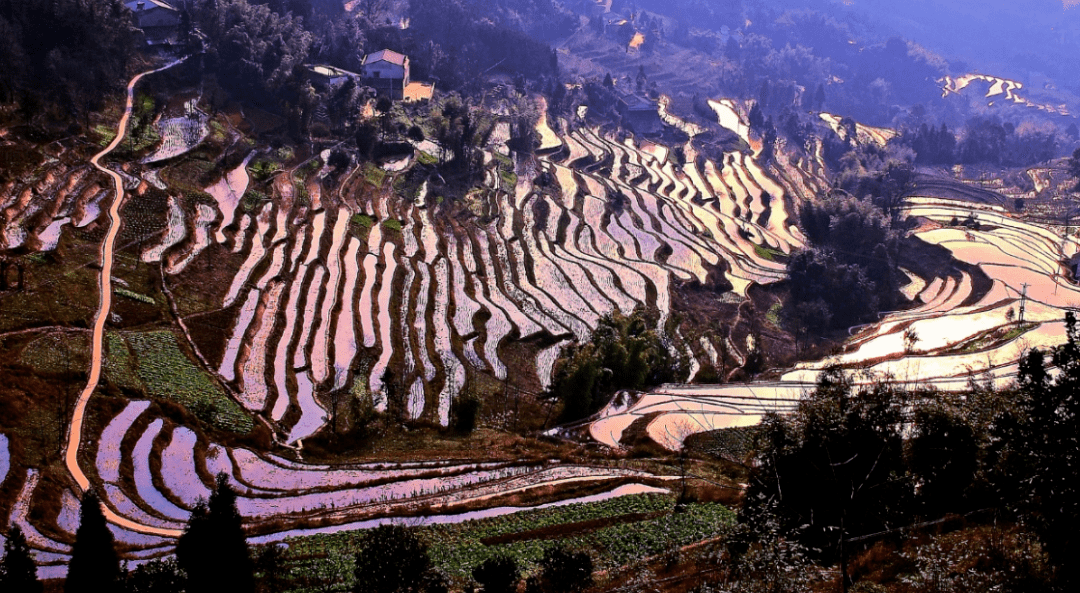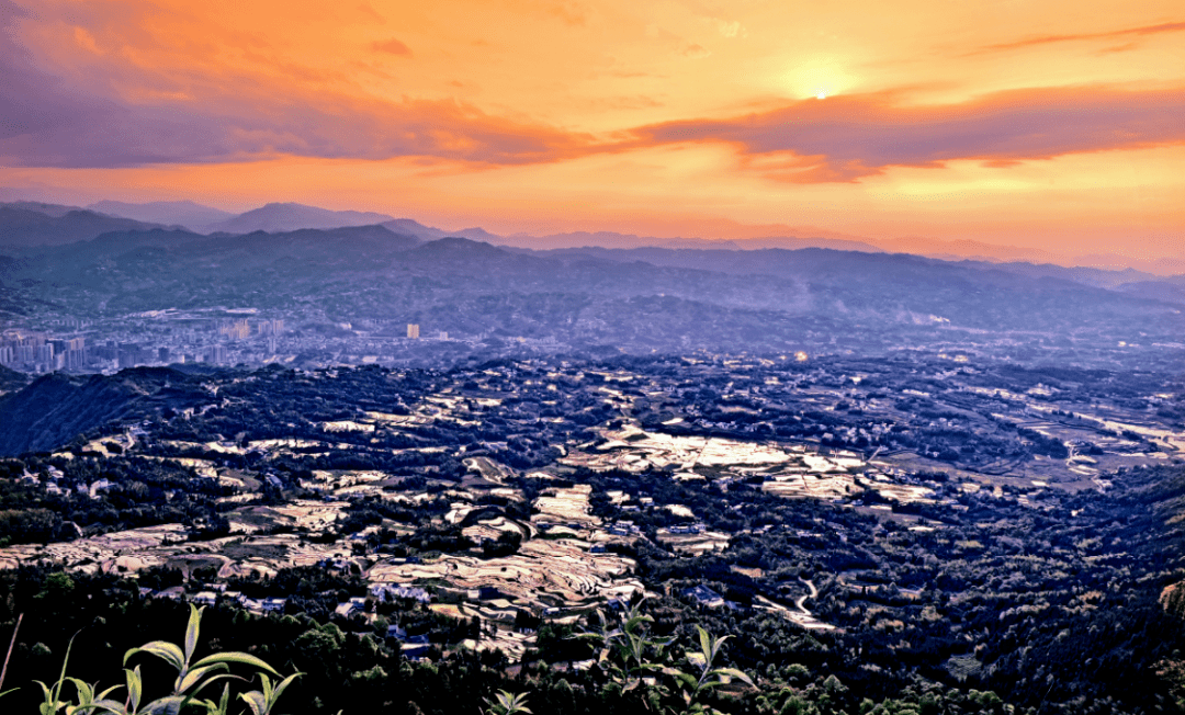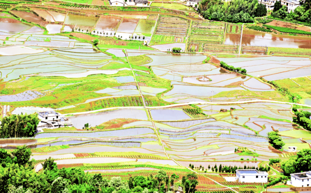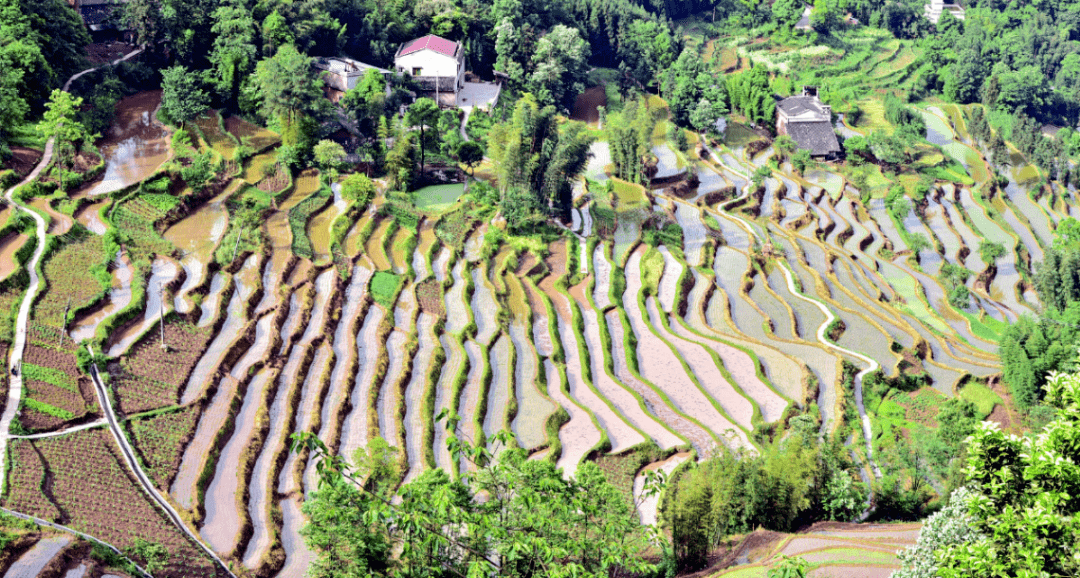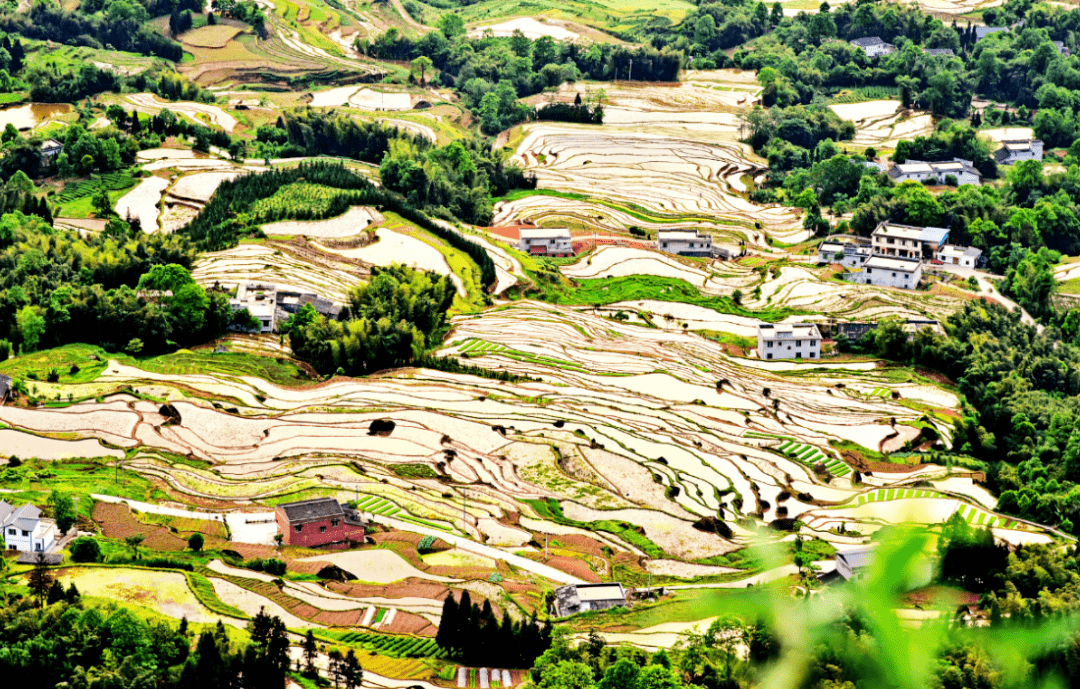 在这春天的犁田插秧时节,从丹山顶峰向山下俯瞰:丹山脚下成片的梯田随着山体沟壑连绵起伏,气势磅礴,川南民居错落有致地点缀在层层梯田之间,宛若“人间仙境,世外桃源”,展示出川南大地田园风光的壮美风姿。
