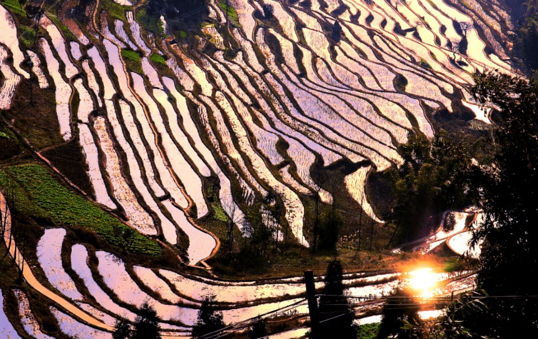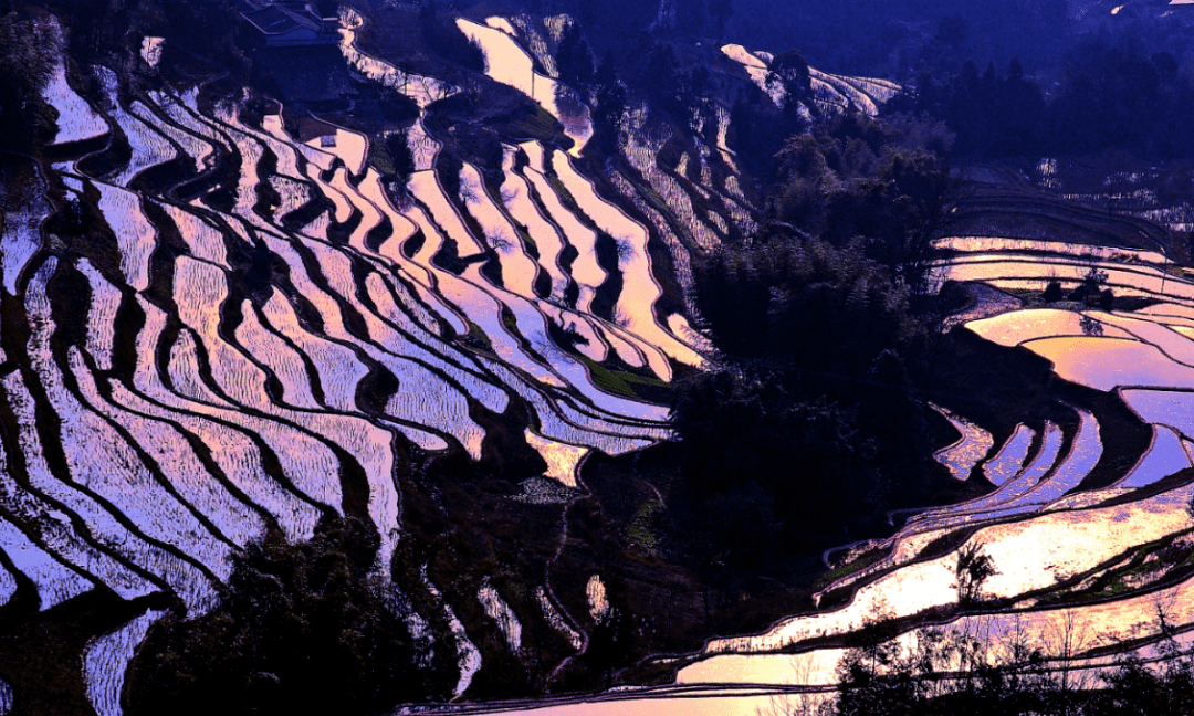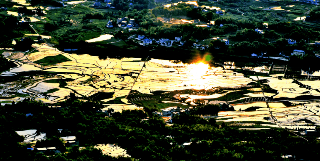 春耕时节,层层叠叠的丹山梯田,在夕阳照射下,形成七彩田园景色,线条优美,景色壮丽,构成了一幅春天的田园画卷。夕阳西下之际,“层叠错落,整齐划一”的丹山梯田宛如明镜,在逆光的镜头里,光影变幻,五彩斑斓,如诗如画。随着光线强弱和光线角度的不断变化,丹山梯田会呈现出各种变幻莫测的多种色彩,美不胜收,令人陶醉,吸引了众多游人和摄影爱好者前往游览拍照。在这里,我们偶遇了许多慕名而来的北京、上海、成都、重庆等地的摄影爱好者和游客。下午6点开始,丹山梯田在夕阳的照射下闪耀着粼粼波光,随着夕阳缓慢西下所产生的光影变化,波光粼粼的丹山梯田的颜色交替改变为鹅黄色、黄色、金黄色、橙色、红色、粉红色、水红色、暗红色、紫红色等多种色彩。当太阳刚刚落山之际,映入眼帘的是满天彩霞和晚霞映射下的波光粼粼的金黄色梯田。夕照丹山梯田的梦幻光影,让众多摄影爱好者和游人心旷神怡,陶醉田园山水之间,“乐不思蜀”而流连忘返。
