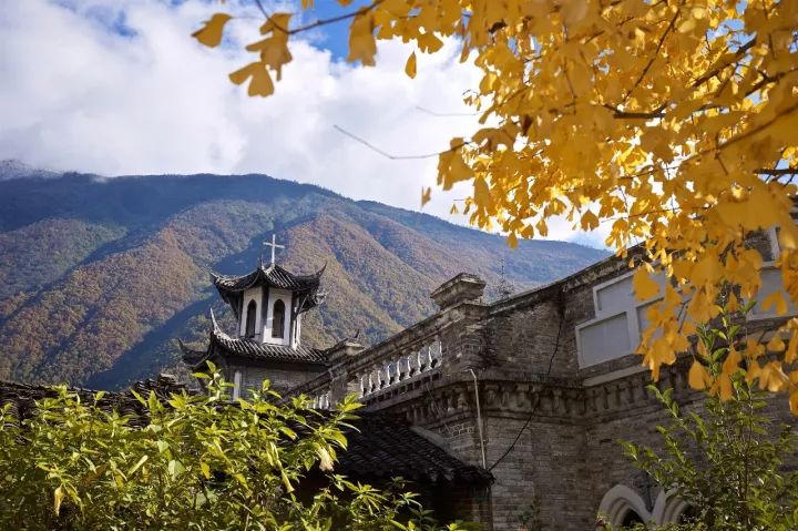清代建筑格调的农舍,白墙黑瓦,层层叠叠,错落有致,与艳丽的海螺沟秋景相互交融,不聒不噪,美得明媚动人。