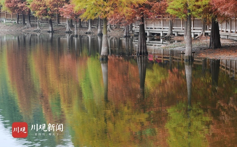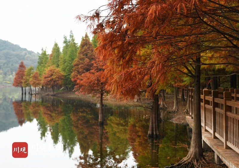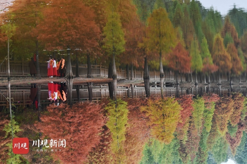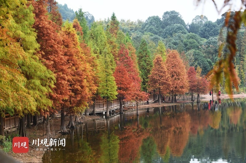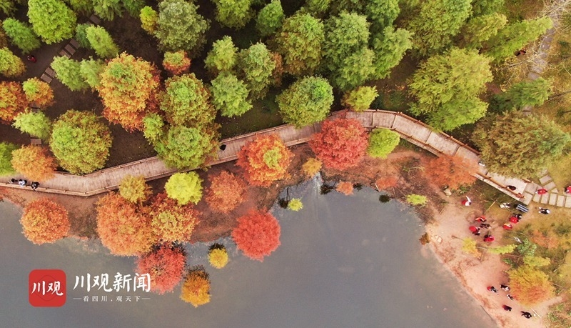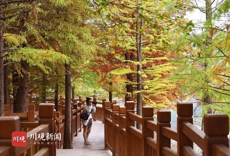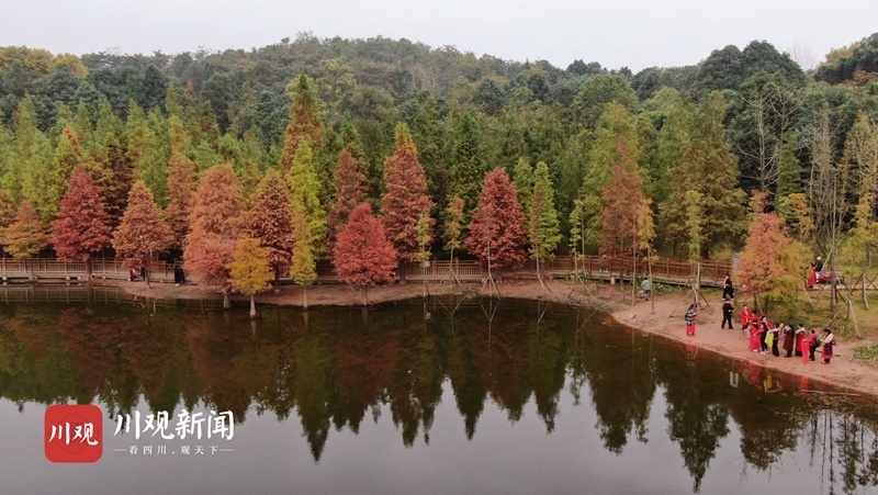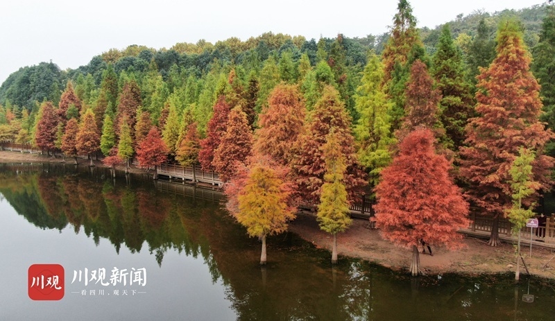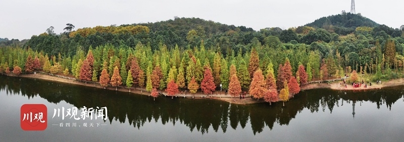 11月4日,德阳市东湖山公园水杉林已逐渐泛黄变红,远远望去,犹如一幅浑然天成的彩色油画,吸引着众多游人慕名而来。