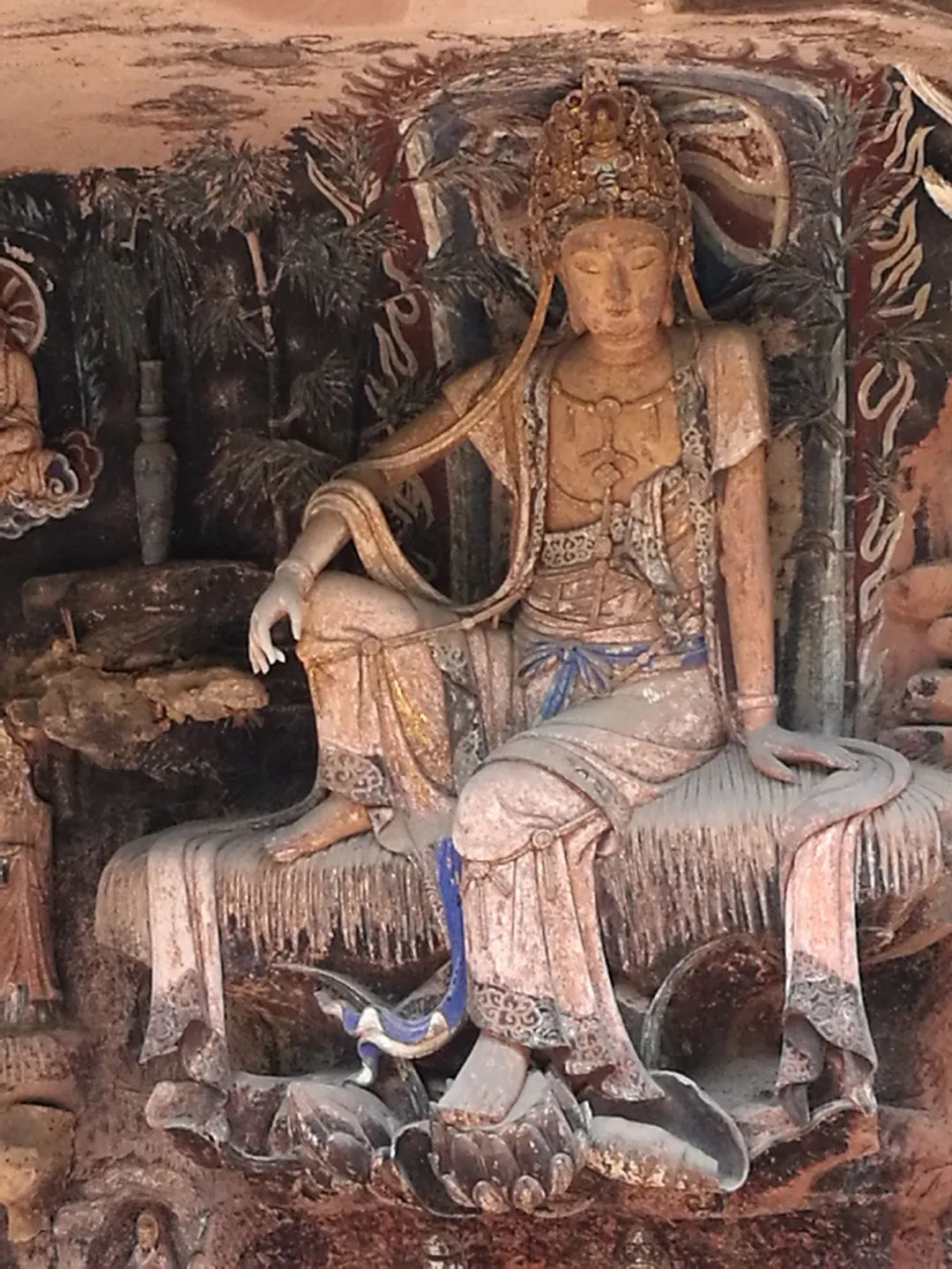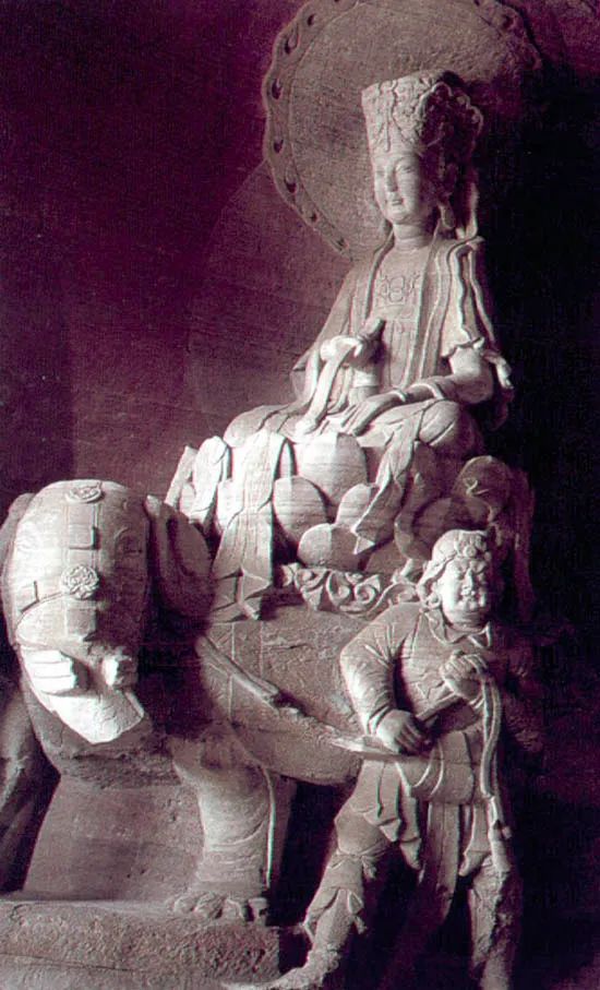 重庆大足北山石刻中的普贤菩萨,趺坐于大象背上,嘴角略往后收,表现出欲笑而略略带羞的微妙神情,不乏清纯之美和娇俏之美,被誉为“东方维纳斯”。如果这尊将普贤菩萨喻之为一位向往人间的怀春少女,那么紫竹观音则堪称韶华斐然的少妇。紫竹观音显示出成熟的魅力,诚如先秦文学《硕人》所形容“巧笑情兮,美目盼兮”,堪称绝妙千古的“美人图”。