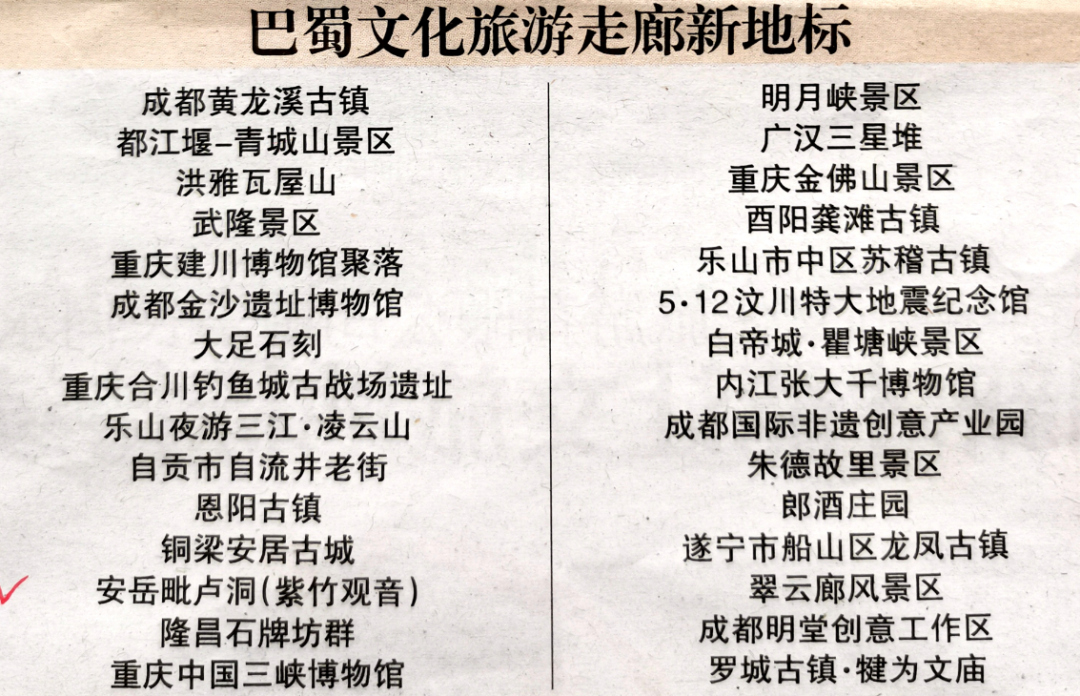 经网友推荐、专家评审,《华西都市报》报于2020年11月19日公布了“巴蜀文化旅游走廊新地标”,计30处,分布于四川和重庆。作为佛教石刻艺术类型,四川仅有安岳紫竹观音进入“新地标”,使之成为四川佛教石刻艺术的“封面”。