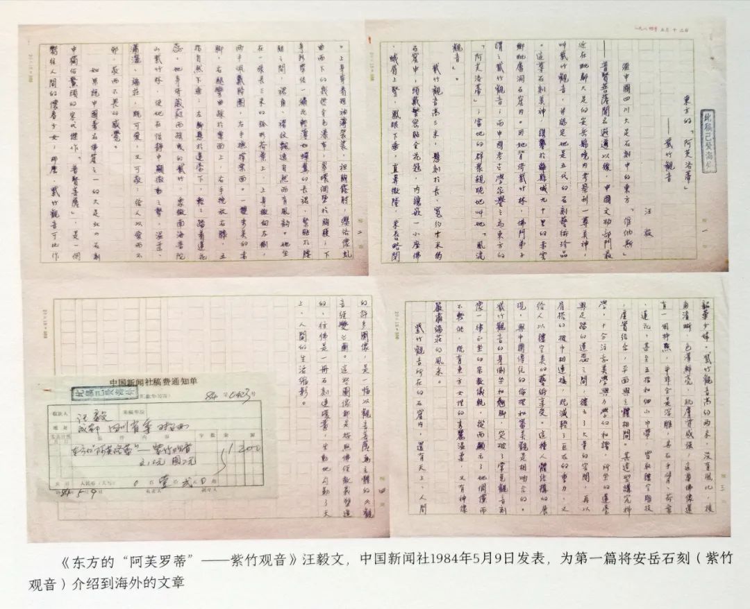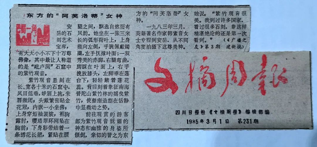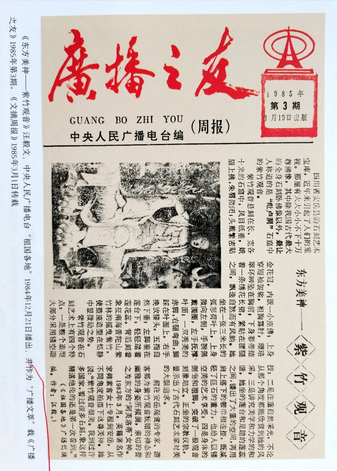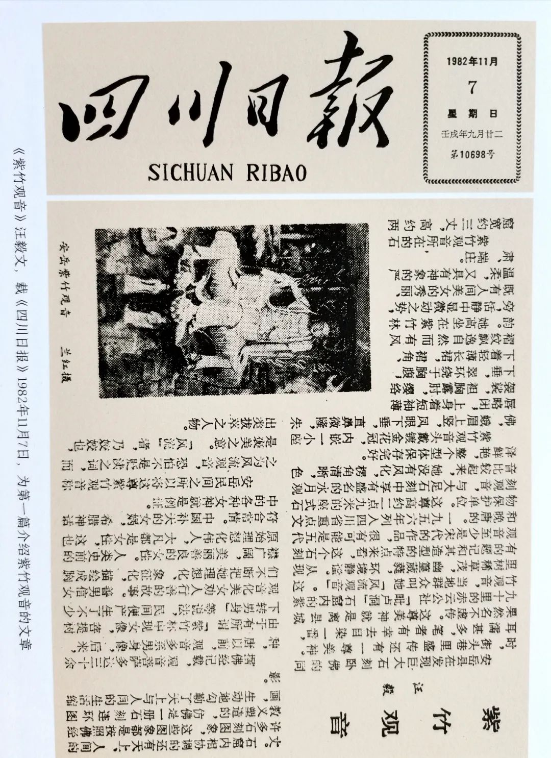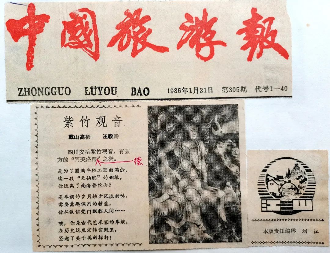颇巧的是,本文作者汪毅曾率先将紫竹观音推介至省级媒体(《四川日报》,1982年11月7日)、国家级媒体(中央人民广播电台,1984年12月21日;《广播之友(周报)》“广播文萃”,1985年第3期,并被《文摘周报》于1985年3月1日转载)发表,率先将紫竹观音通过中国新闻社(1984年5月9日)向海外介绍。此外,作者还率先以诗配图的形式在《中国旅游报》(1986年1月21日)发表,并刊于其所著《中国佛教与安岳石刻艺术》(中国旅游出版社,1989年)封面。
