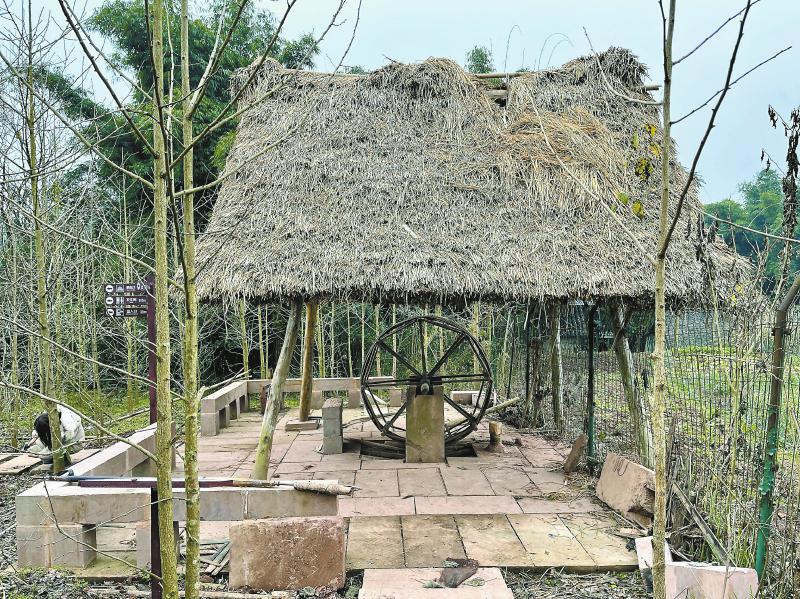 记者走进大顺灶遗址,只见井眼、储卤池、晒盐坝、灶房修缮如旧。顺着坡路而上,四周满是翠竹,不时能看到“上广井”“坟山井”“坝子井”等古老井眼,井场四角以木质大柱撑起茅屋,避免日晒雨淋。计量缸和储卤池连为一体,上面有6根石质柱础支撑的小青瓦屋,下面则是3个储卤池。扳车匠(筒匠)将卤水倒入计量缸,再放入储卤池储存,等待晒水匠抽入晒盐坝晒卤。