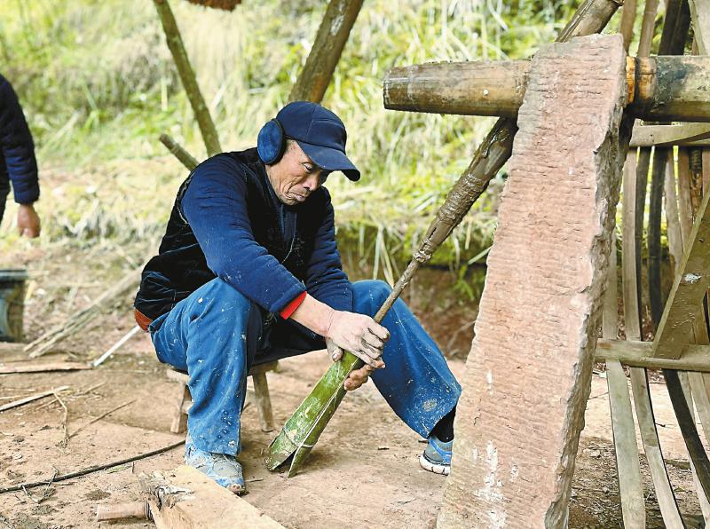 这里翠竹环绕,星罗棋布的农家小院掩映其中,穿过竹林下的石阶小路,20余口具有北宋特色的老盐井分布各处。在一处名为“乱葬坟井”的井眼处,3位师傅正在制作打捞工具。其中,廖吉荣是卓筒井井盐深钻汲制技艺的省级传承人,他指着一旁的三四根大楠竹筒说:“这是刚从井下打捞出来的套管,有一两百年的历史了,现在要重新下新的套管。”