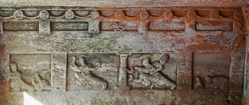 这不是简单开凿的几个崖洞。远远望去,一号崖墓的门楣处,可以清晰看到雕刻的斗、柱枋、瓦当、板瓦、椽头、连檐等仿木构建。崖墓之内,俨然是墓主为自己死后营造的“家”。进入其中,首先是一处宽十余平方米的享堂;享堂后的三室,才是墓主长眠之所。仅这一处崖墓,用于装点的壁画,便多达27处。