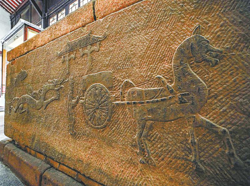 青龙、白虎、玄武、朱雀四神,也成为主角。在博物馆陈列室,石棺之上的四神云气图雕刻得尤为气韵生动。古代工匠凿刻出从人世到仙界的过程:腾云驾雾的青龙护送着承载主人灵魂的马车,张牙舞爪的虎和灵秀的朱雀是护卫,他们共同护送着主人到达天门。而双阙刻画的天门处,门吏正躬身迎接主人的到来。整幅雕刻,画面气势恢宏,灵动飞扬,堪称艺术精品。在另一幅剔地浮雕石刻中,西王母端坐中间,左龙右虎以及九尾狐、三足乌、玉兔等瑞兽环侍,这正是古人心中的神话世界。