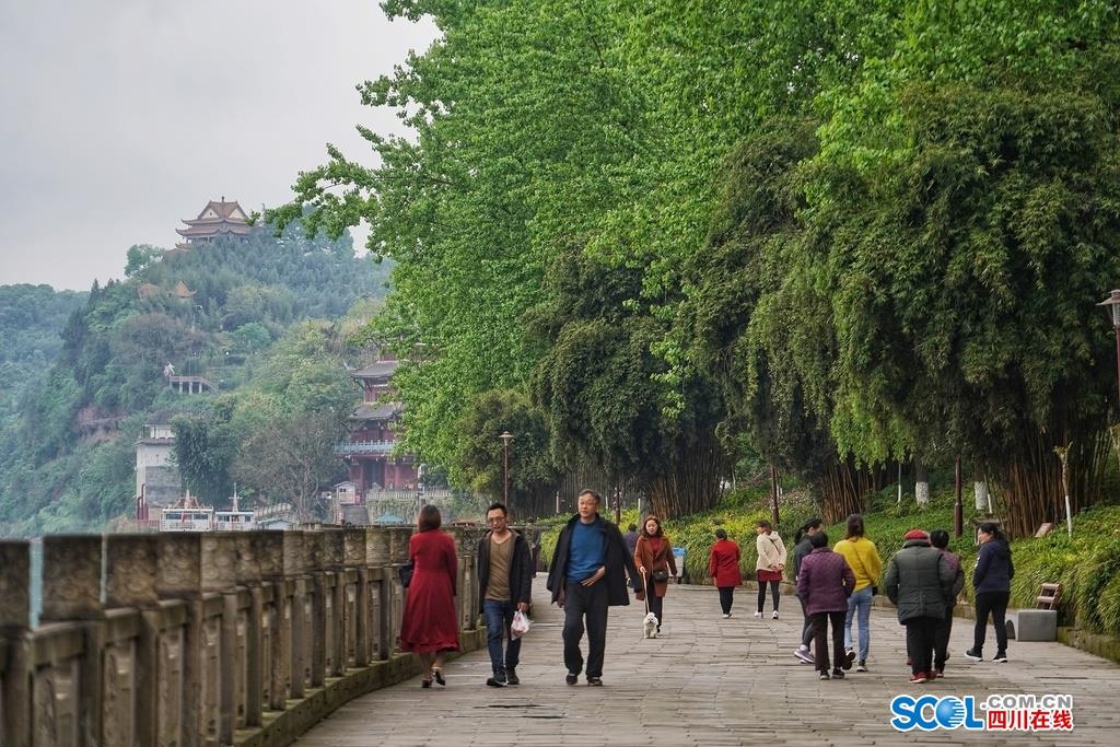 在为纪念盛唐著名画家吴道子而建的画圣广场上,凭栏可眺望临江的古镇全貌。