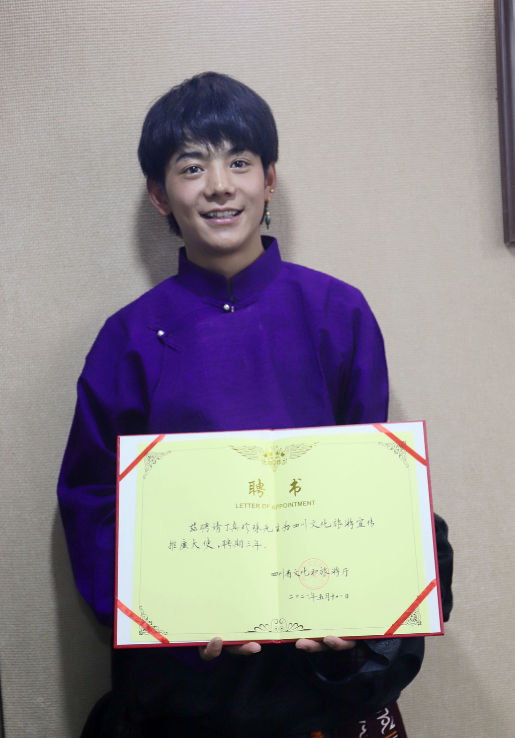 当天,四川省文化和旅游厅正式向丁真颁发聘书。聘书上写到,聘请丁真珍珠先生为四川文化旅游宣传推广大使,为期三年。接过这份沉甸甸的聘书,丁真满脸笑意,充满信心,同时竖起大拇指为四川文旅打call。