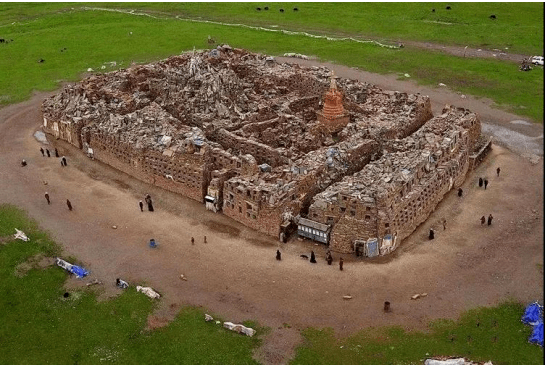 整座石经城外部颜色呈暗红色,据当地人介绍,这是因为建造之初,整座城被喷洒过一种从天然植物中提炼而成的红色染料所致,经历了千年风雨的洗礼,到如今颜色依然清晰艳丽。由于日积月累的堆砌,城体已开始下陷,而石经城的地下部分和地上部分一样高。