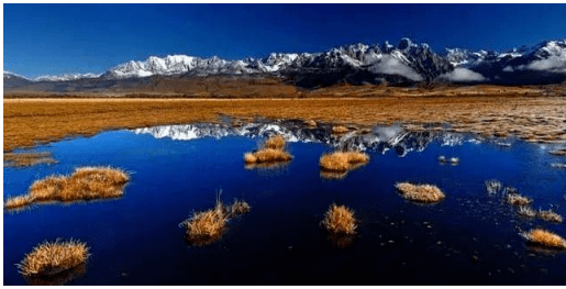 生长在水中的红草,大都疏密相间,像灌木枝扎根在水池中。这些红草在阳光的照射下,紫里透红,非常吸引眼球。海子里有一些散落无序的顽石点缀其间,平添几多浪漫。远处山腰斜坡上硕大的藏文六字真言,发散着一种雪域高原的神秘与庄严。