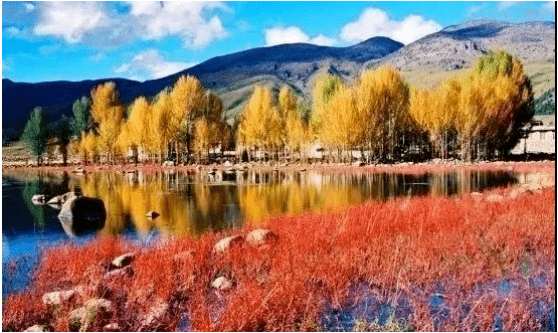 在稻城县城以北28公里处,桑堆镇公路边,有一个小水塘,每年秋天布满了红色的水草,这里便是稻城美丽的红草地。